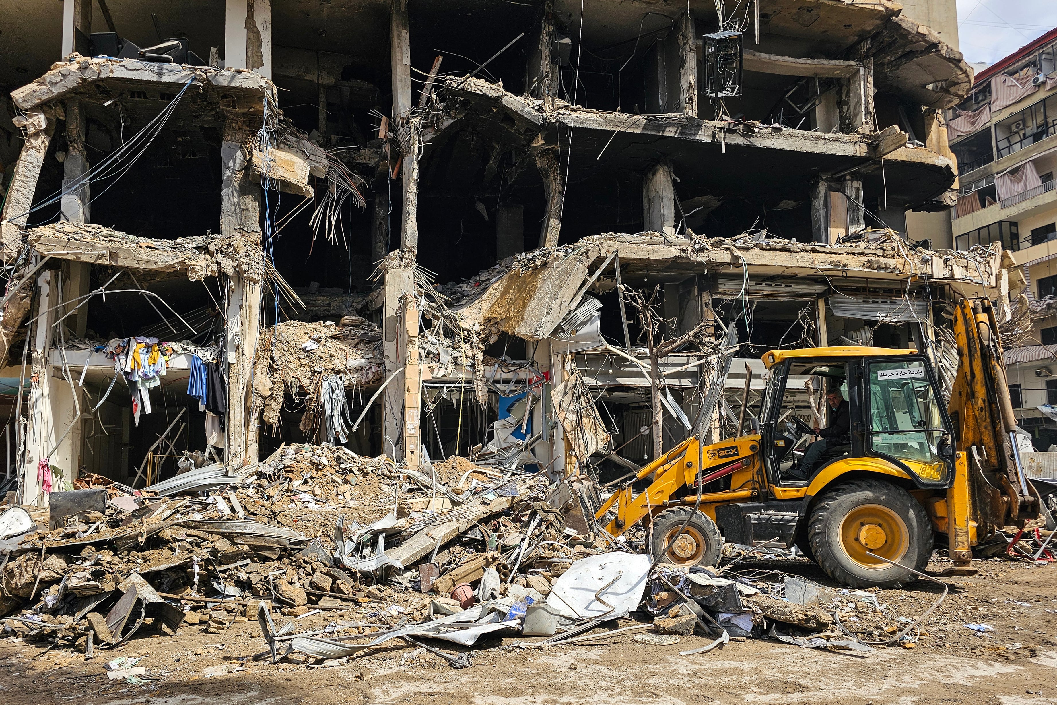 A bulldozer clears rubble from a street at the site of an Israeli airstrike in Beirut’s southern suburbs on March 27, 2026. (AFP via Getty Images)
