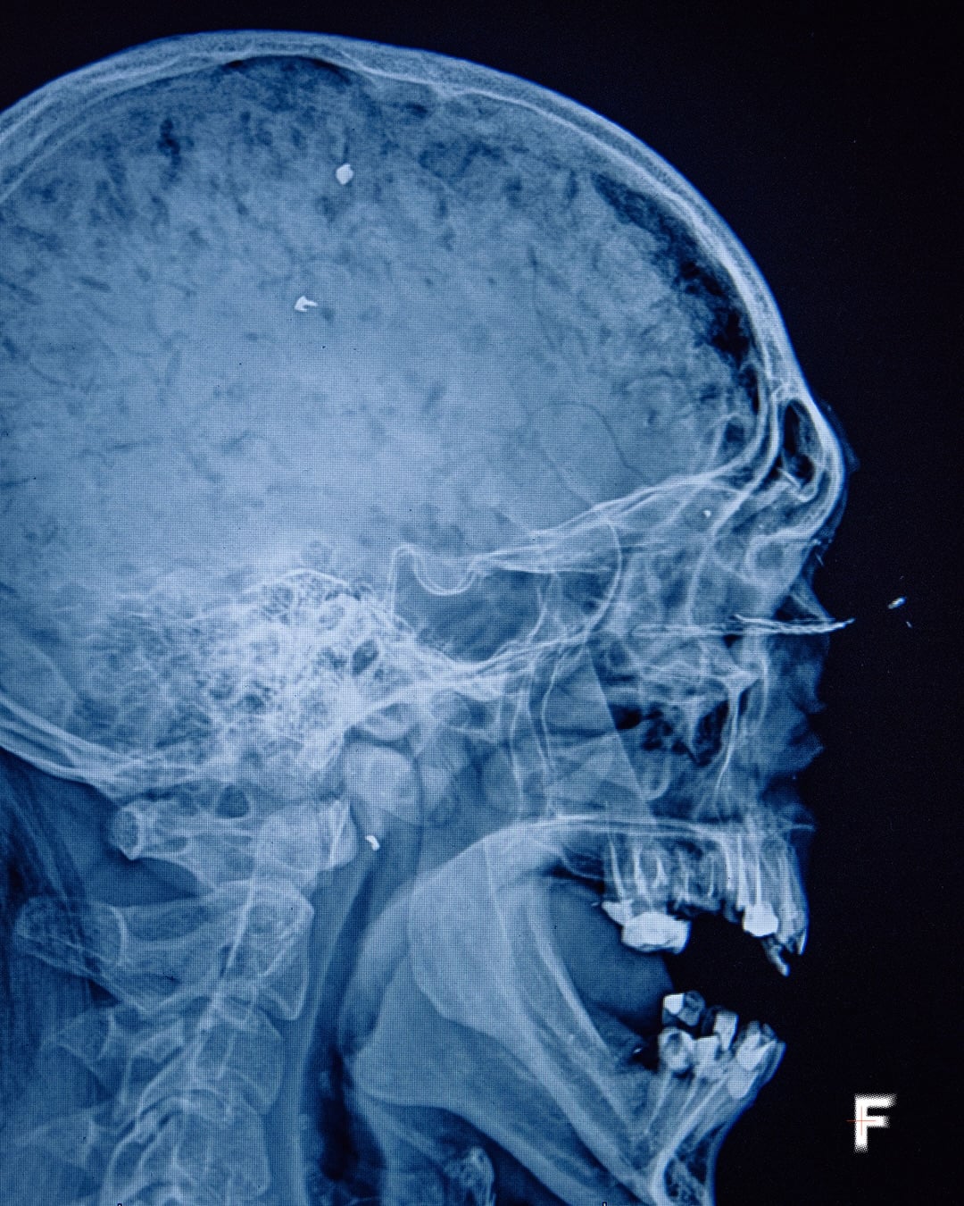 that x-ray of his head shows ***pneumocephalus,*** as you can see the brain circunvolutions.