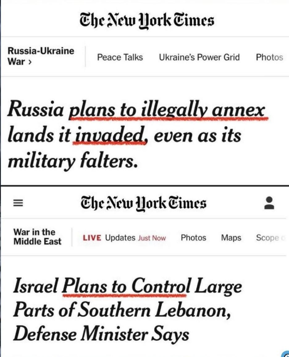 Трябва да си много назобан с антизападна и антидемократична пропаганда, че да не можеш да направиш разлика между рашистката агресия срещу съседи и загубернии, включително България. И отговора срещу непрекъснатите ракетни атаки от Хизбула провеждани от териториите за които става дума.