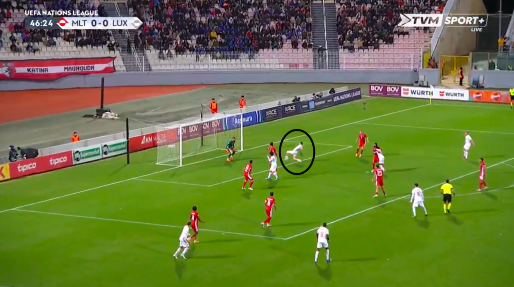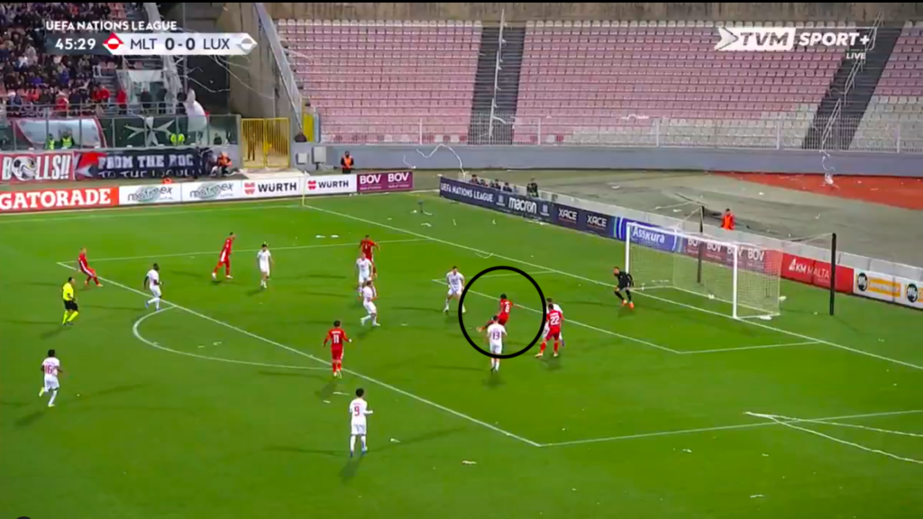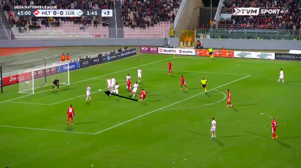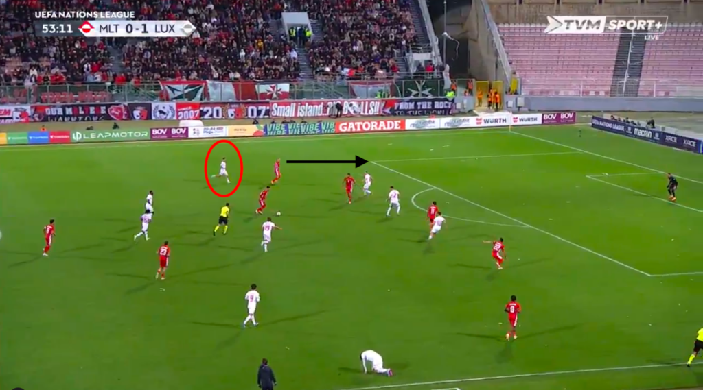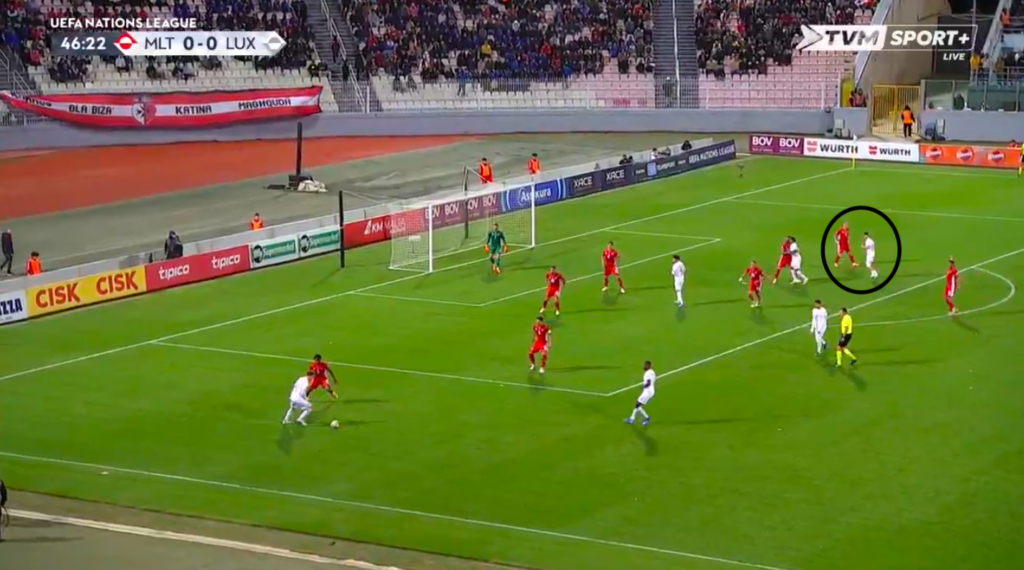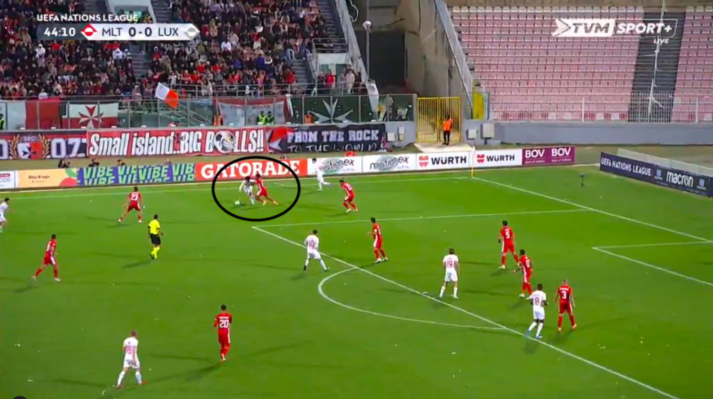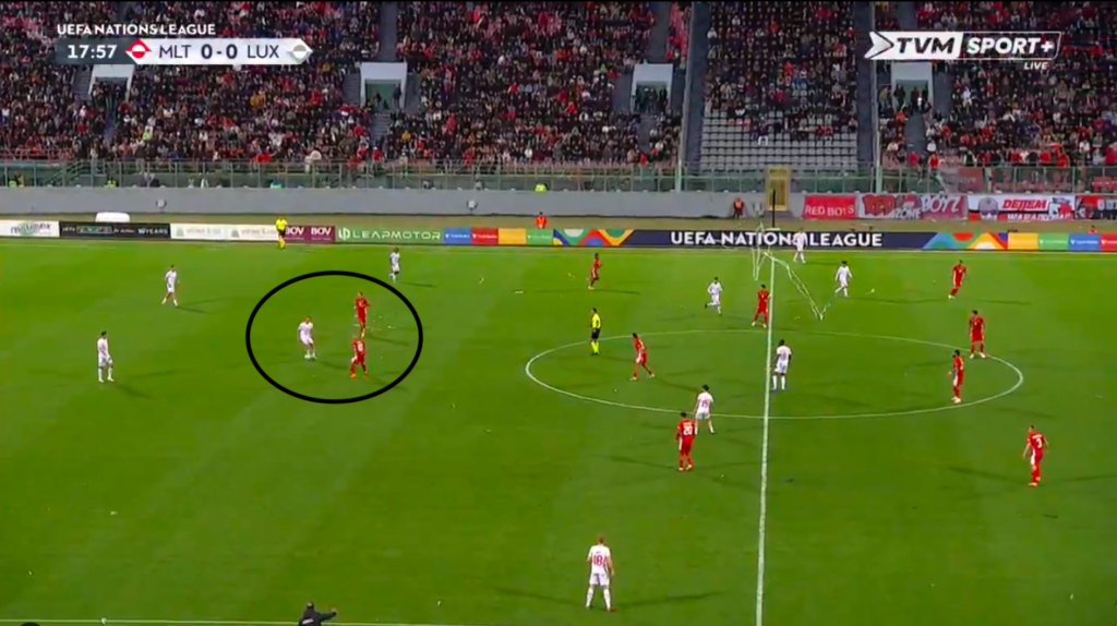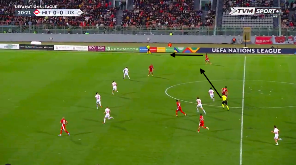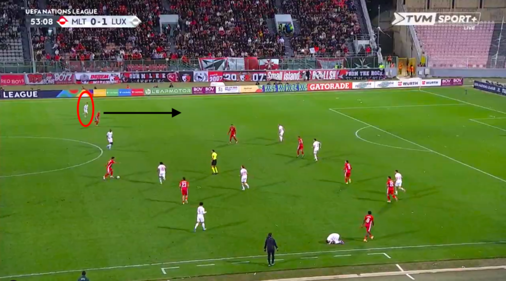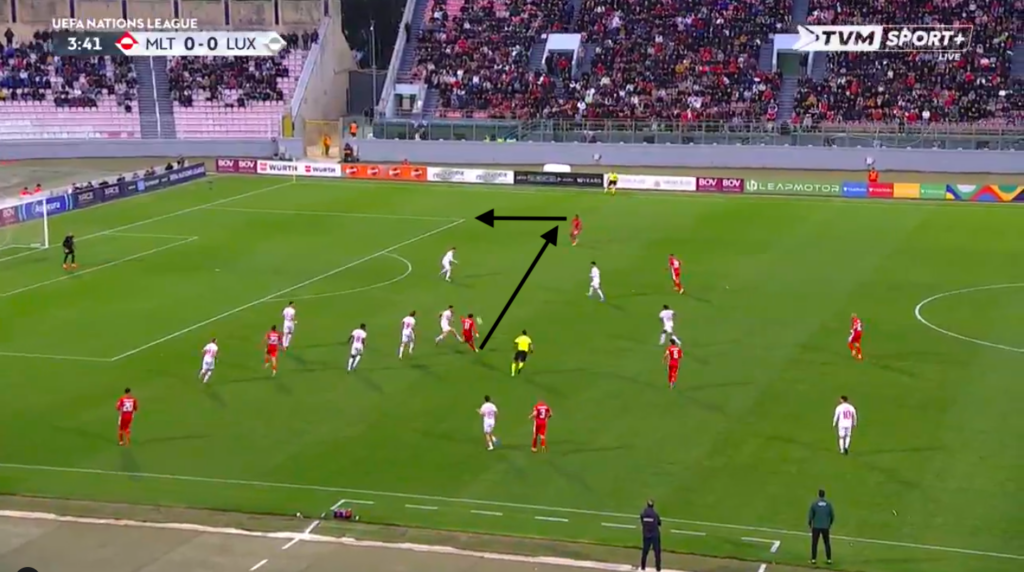 Here, Ryan Camenzuli (black arrow) pushes up to overload – an instance where Luxembourg’s right winger fails to track properly.