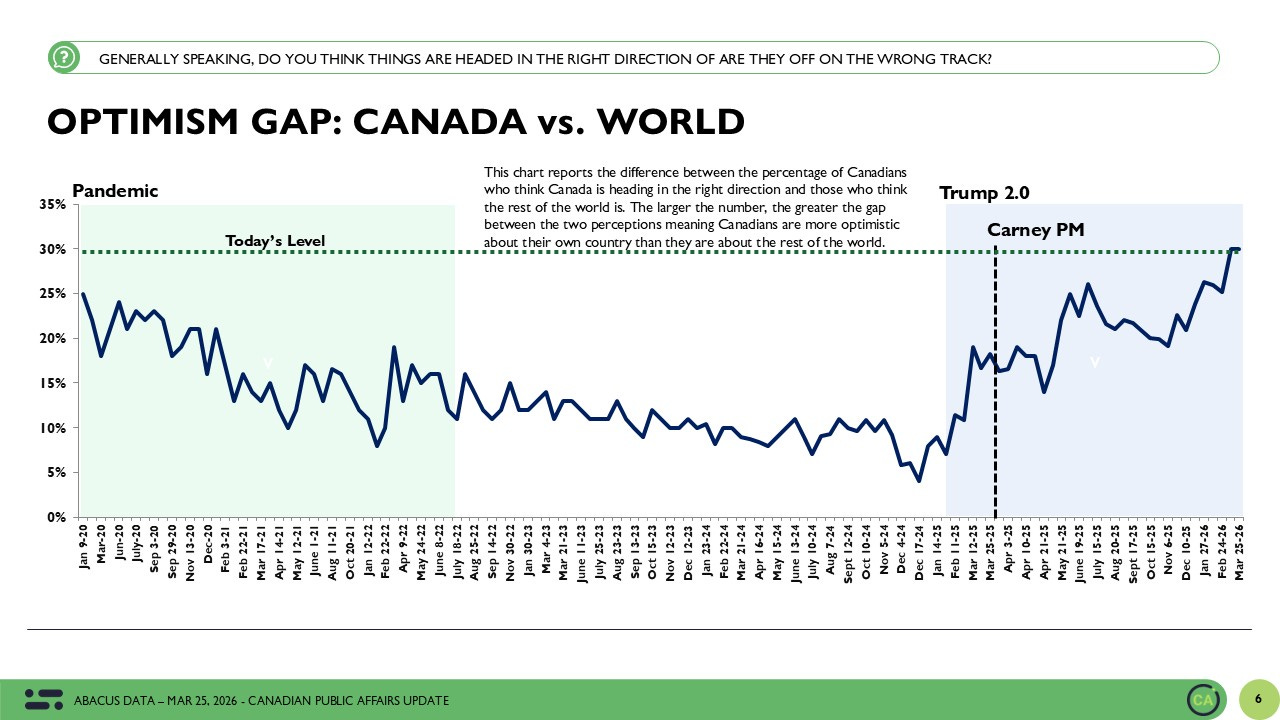 At the same time, views of the world remain overwhelmingly negative. Only 13% think things globally are headed in the right direction, and views of the United States are just as bleak. That gap between how people see Canada and how they see everything else is still one of the defining features of public opinion right now.