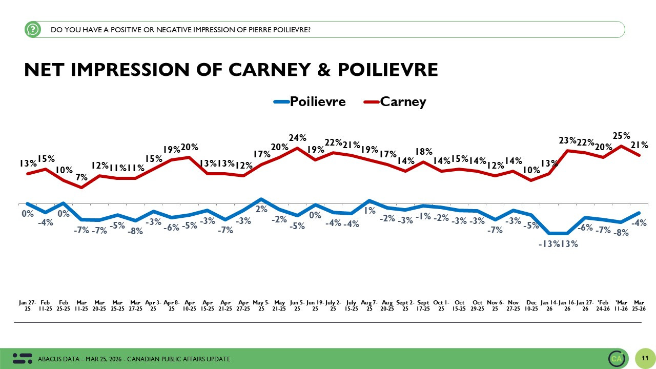 Leader impressions haven’t moved much either. Mark Carney remains clearly in positive territory with a net favourability of +21. Pierre Poilievre is still negative at -4, though that’s a bit better than where he was earlier in the month.
