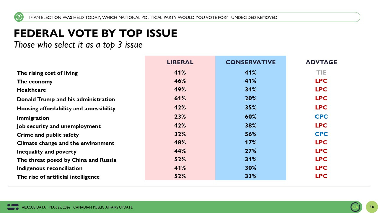 When people are focused on global instability, they tend to lean more toward the governing party. You can see that clearly in the issue data. Among those who say Donald Trump and his administration is a top concern, the Liberals lead by a wide margin, 61% to 20%.