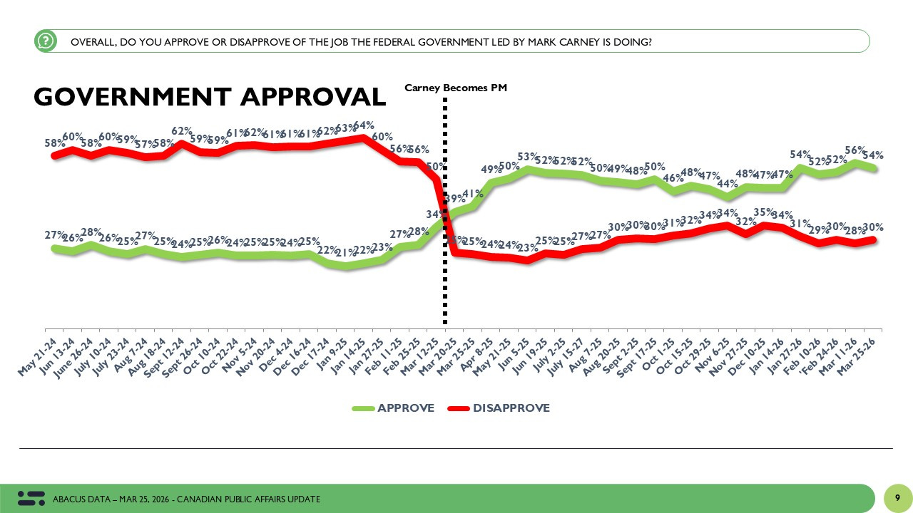 Government approval is still solid. Right now, 54% approve of the job the government is doing and 30% disapprove. That’s down slightly from our last wave, but still comfortably in majority territory. For a government that’s now a year into its mandate, those are good numbers.