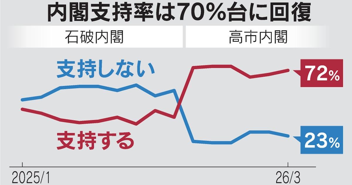 Takaichi Cabinet approval rating rises 3 points to 72%; 65% “approve” of the Japan-U.S. summit.