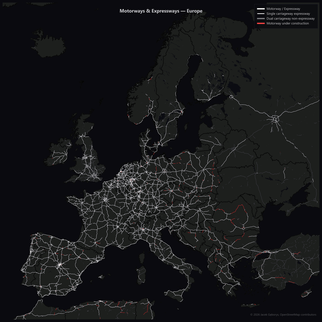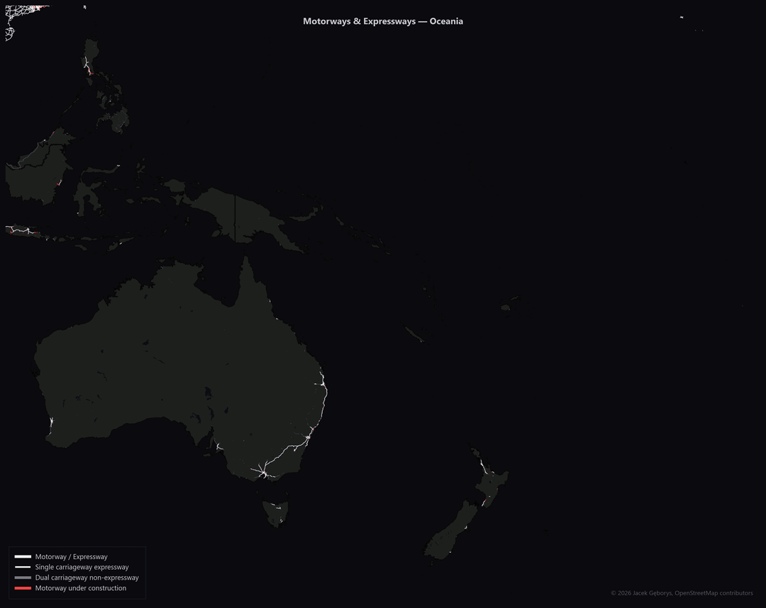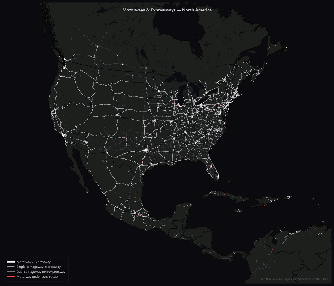 Dual carriageways (non-motorways) shown separately look similar but still have at-grade crossings and conflict points.