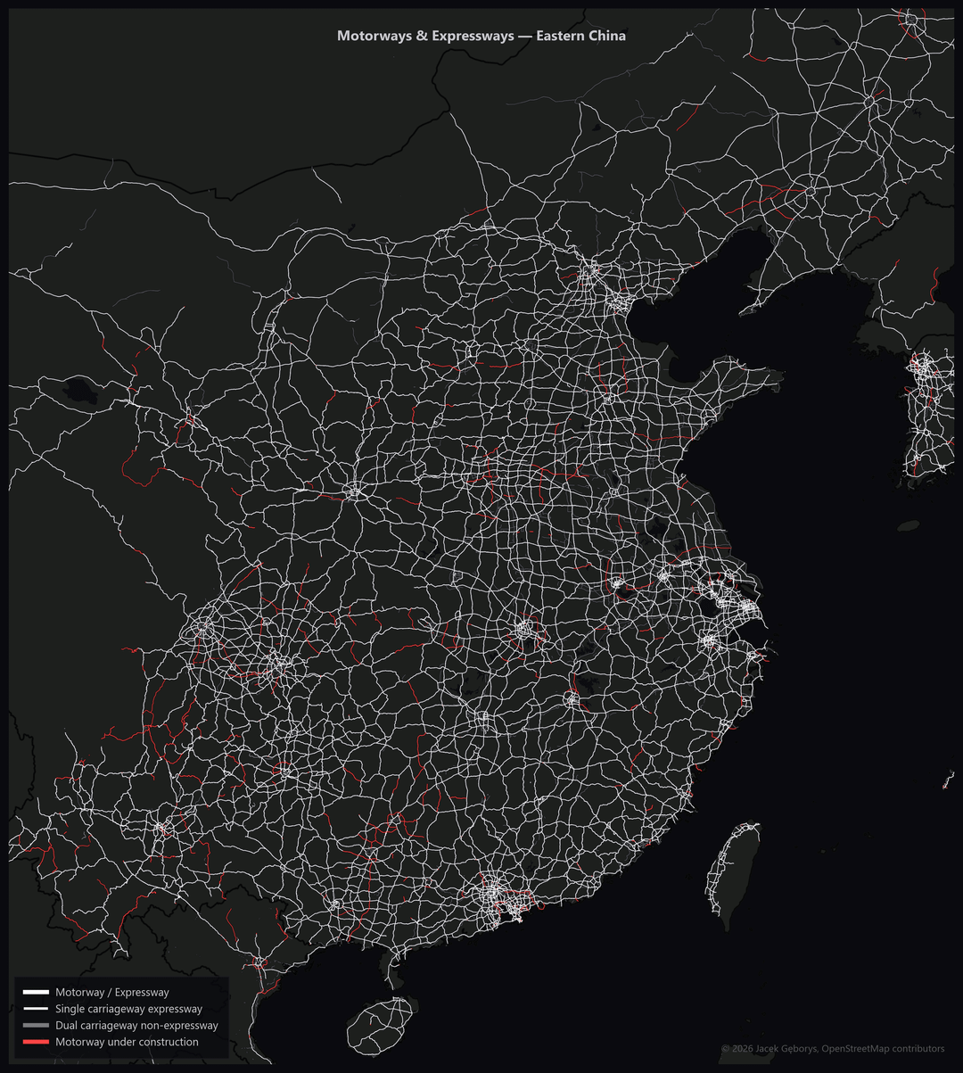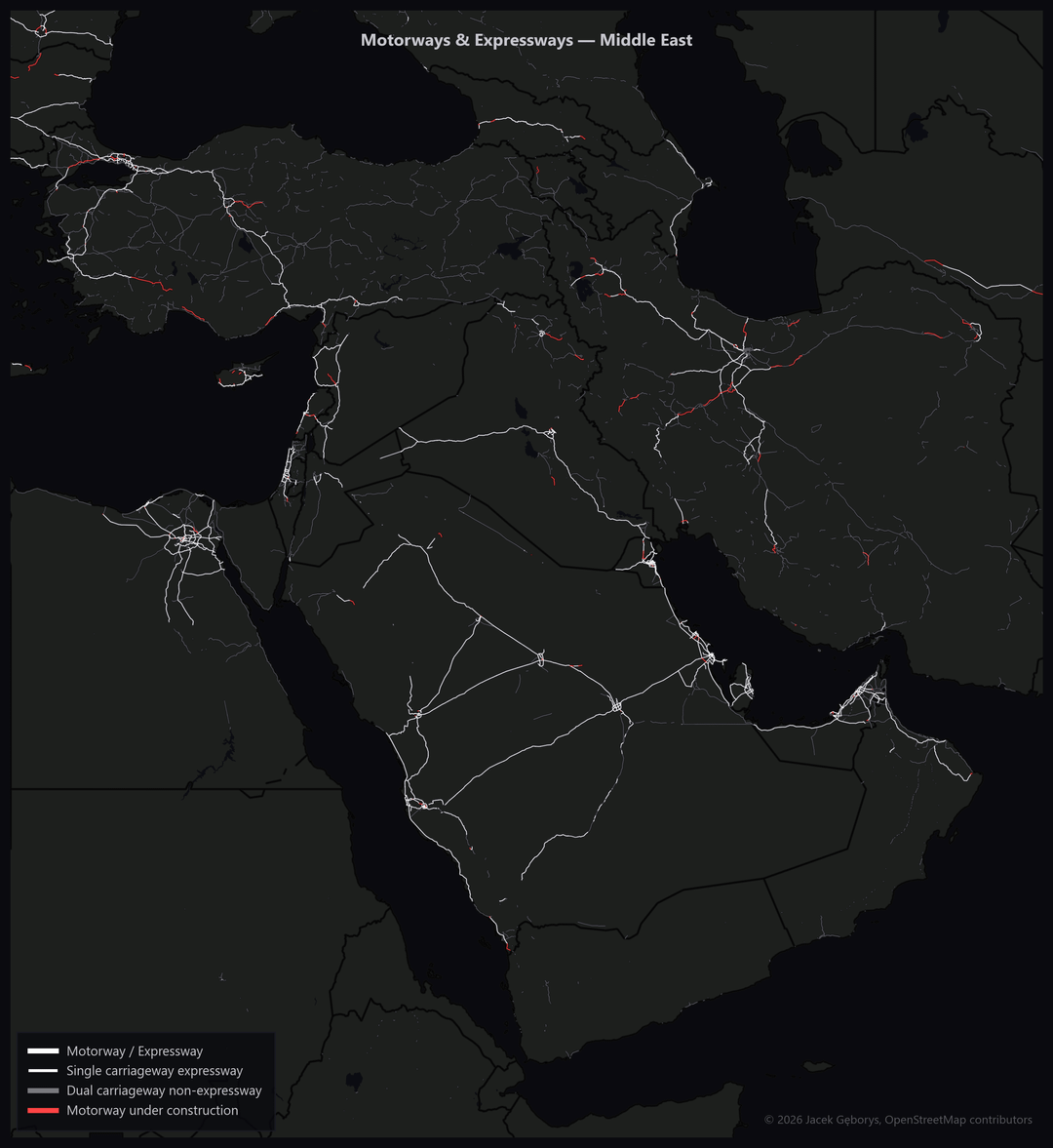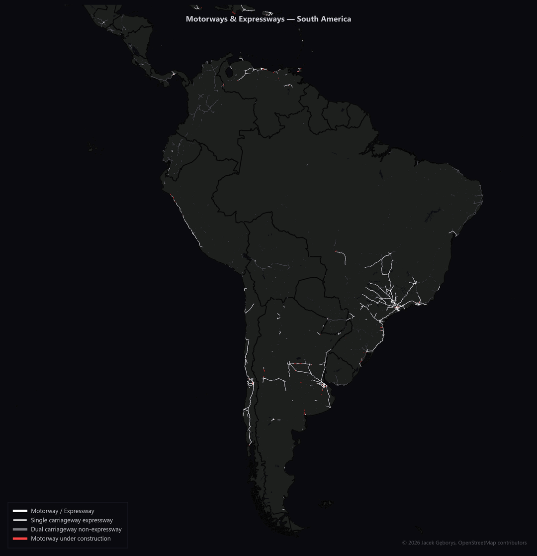 Dual carriageways (non-motorways) shown separately look similar but still have at-grade crossings and conflict points.