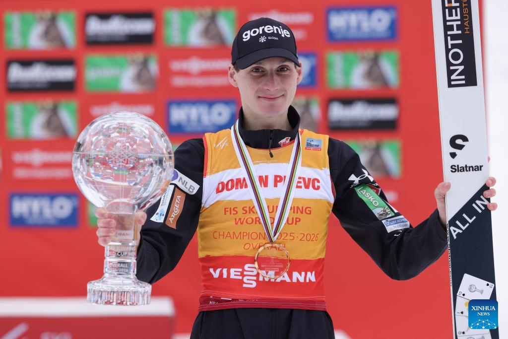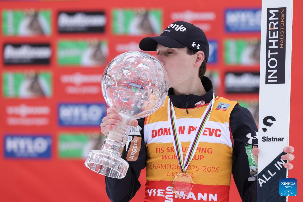 Domen Prevc of Slovenia celebrates during the awarding ceremony for the men’s individual ski jumping event at 2025/2026 Viessmann FIS Ski Jumping World Cup in Planica, Slovenia, March 29, 2026. (Photo by Zeljko Stevanic/Xinhua)