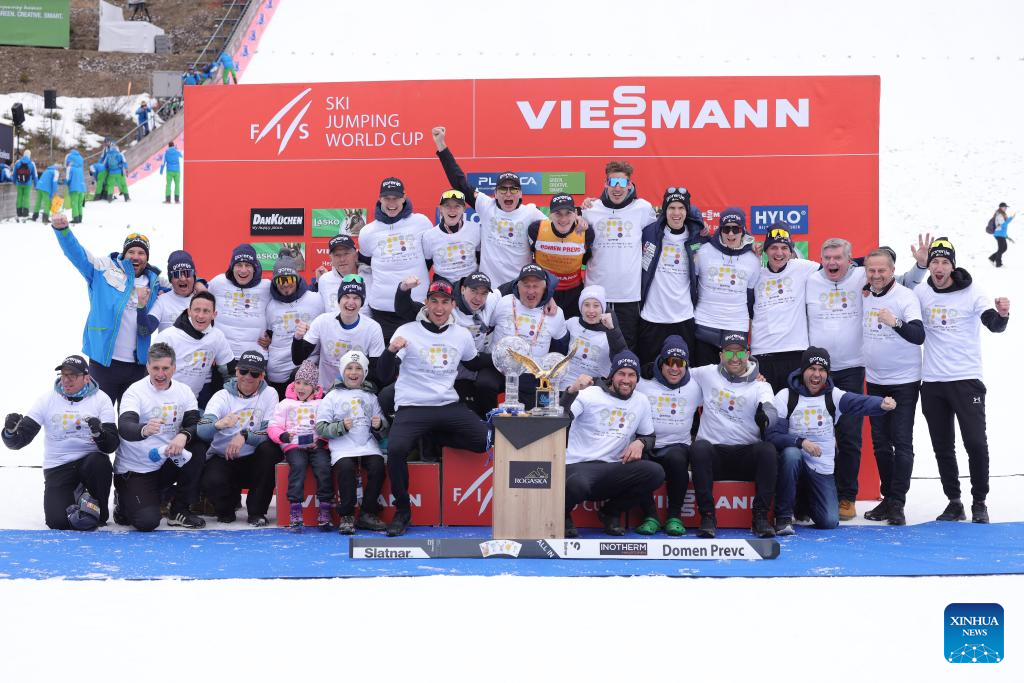 Domen Prevc of Slovenia celebrates with his team after the awarding ceremony for the men’s individual ski jumping event at 2025/2026 Viessmann FIS Ski Jumping World Cup in Planica, Slovenia, March 29, 2026. (Photo by Zeljko Stevanic/Xinhua)