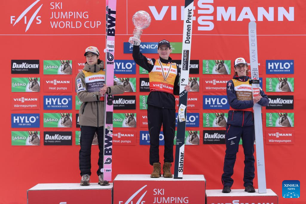 Winner Domen Prevc (C) of Slovenia, second-placed Kobayashi Ryoyu (L) of Japan and third-placed Daniel Tschofenig of Austria pose during the awarding ceremony for the men’s individual ski jumping event at 2025/2026 Viessmann FIS Ski Jumping World Cup in Planica, Slovenia, March 29, 2026. (Photo by Zeljko Stevanic/Xinhua)