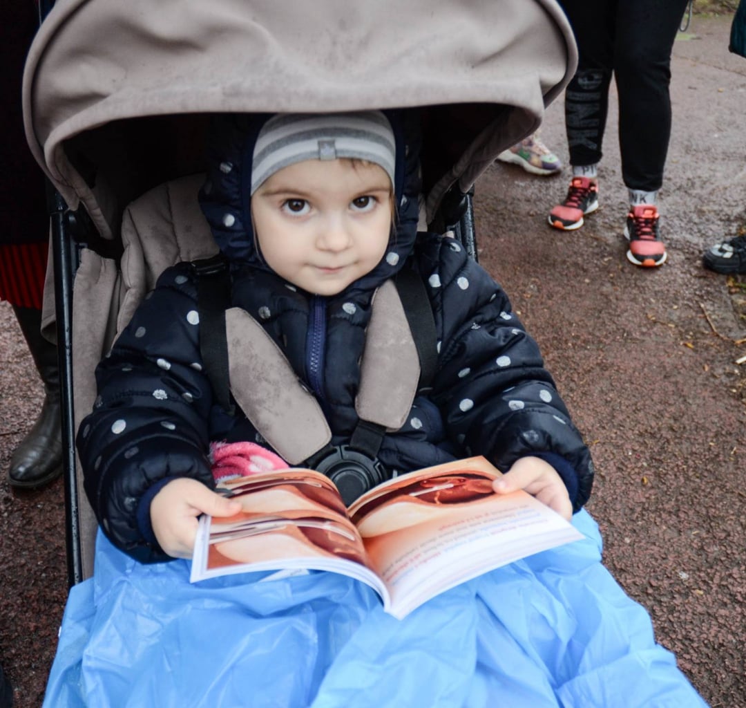 Copilul din căruț se uită o carte în care este prezentat avortul în imagini. 😅 Cat de prost să fii ca să îi arăți așa ceva unui copil atât de mic?