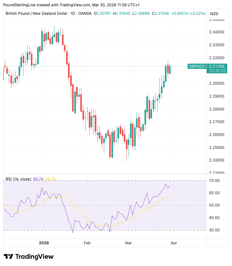 GBP/NZD trades at 2.3144 on Monday, extending a strong recovery from the late-February low of 2.24.