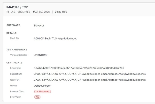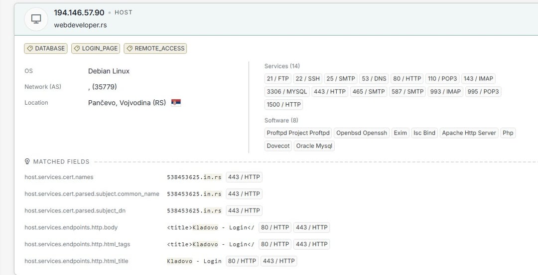 It should only be noted that the user ADMIN code is ADMIN123. The company behind this is webdeveloper. rs, which had several services on that host, including its own site, where the TLS certificate with the web domain 2538453625 was running. [.]in[.]rs – in both cases the domains are on mCloud.