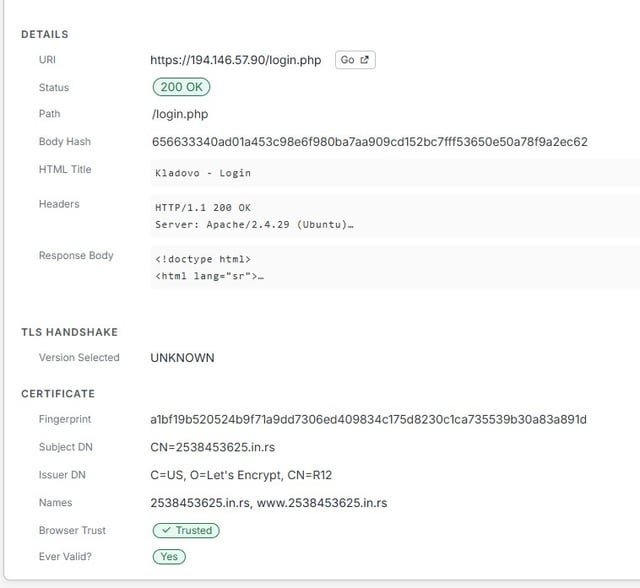 Šta je sa domenima/sertifikatima? Na fotografiji vidim 25384536251.in.rs na ekranu a na skrinšotovima 2538453625.in.rs (bez jedinice). Podatke o sertifikatu za domen bez jedinice nalazim na [crt.sh](https://crt.sh/?q=2538453625.in.rs), a sa jedinicom [ne](https://crt.sh/?q=25384536251.in.rs). Domen sa jedinicom mi resolvuje na 194…54 adresu, bez jedinice ne. Takođe, na nekim skrinšotovima vidim adresu koja se završava sa 90 a negde 54.