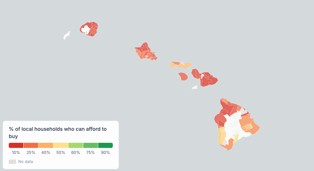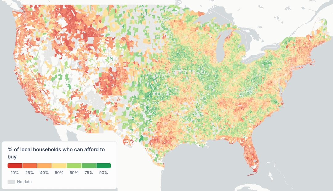 Important note: This measures homeownership affordability only. It uses household income, not individual. "Affordable" = total monthly housing cost under 33% of