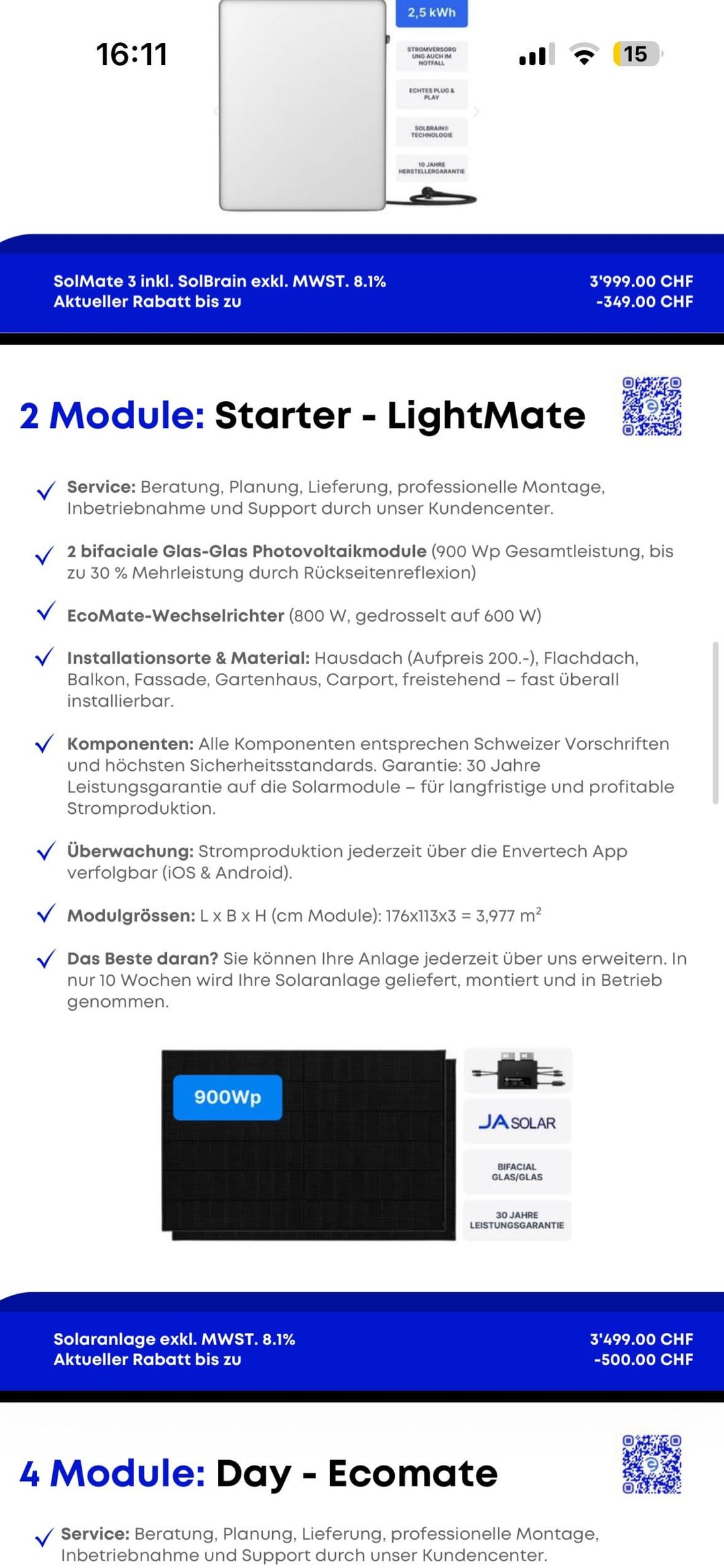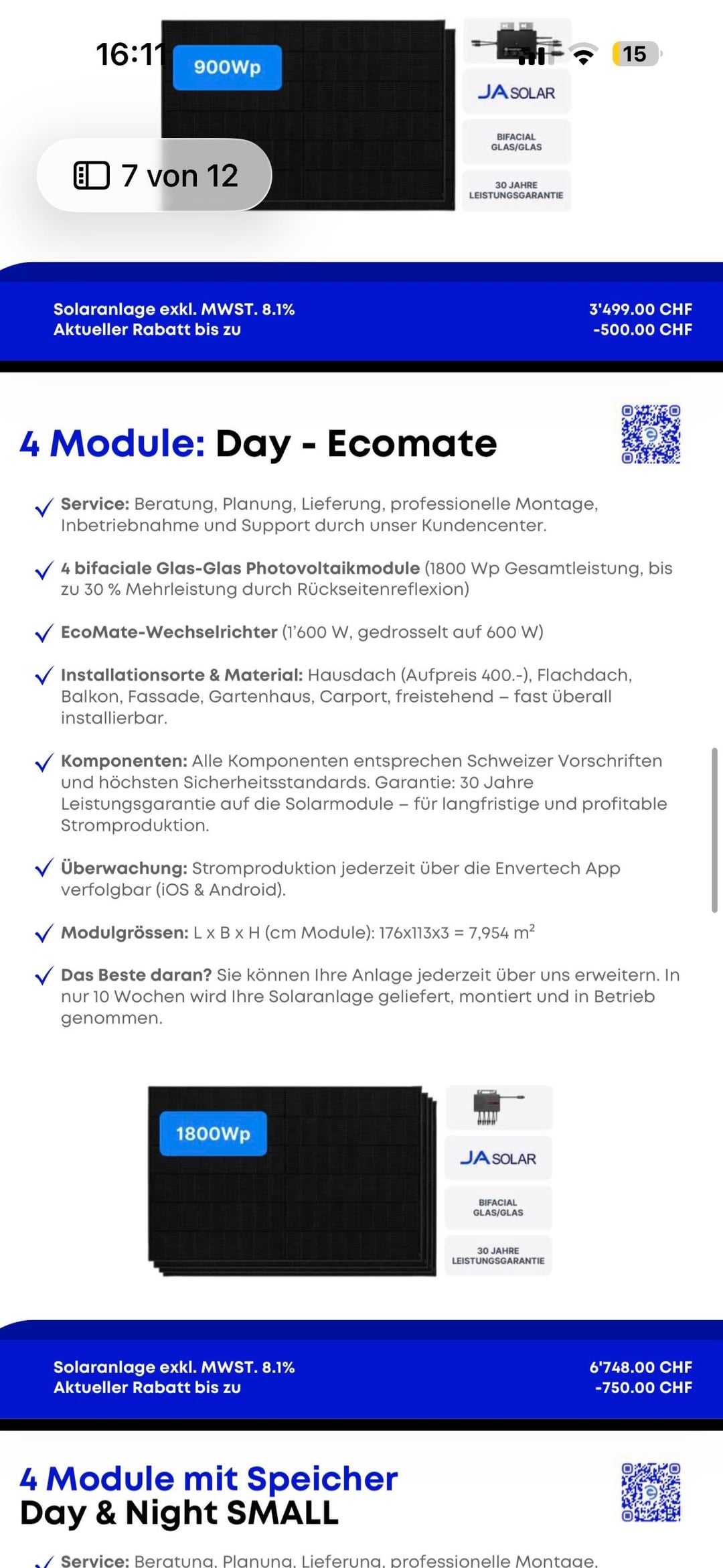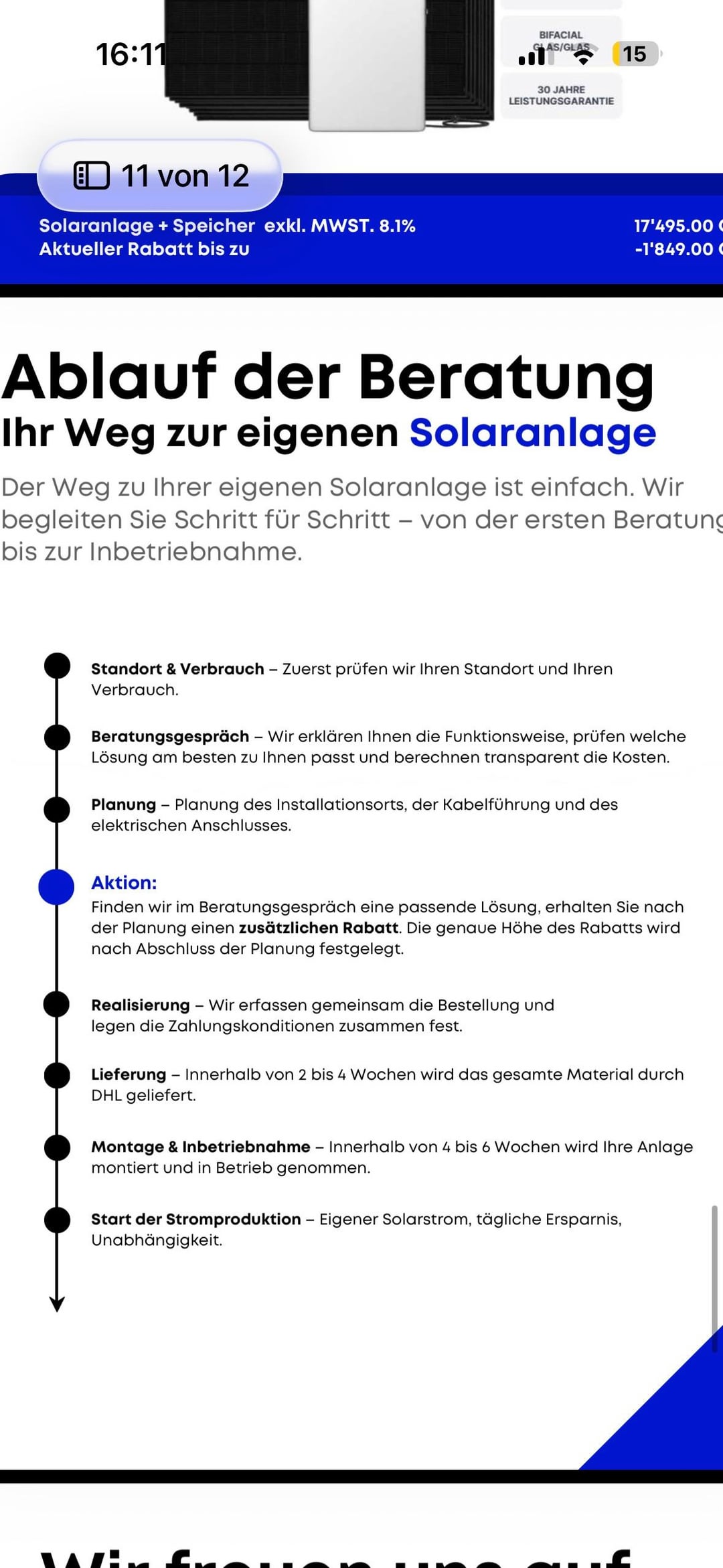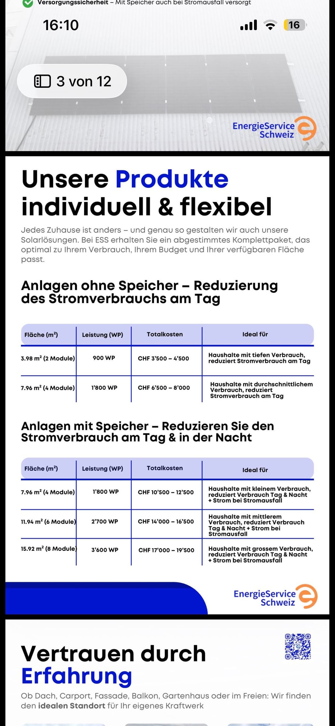 They came to my parents house and asked them if they would be interested. They received an Offerte a few minutes later and 3 days later they came again and already wanted them to sign the Kaufabschluss – when they hesitated, they told them just buy the smallest one (2 panels) and wanted an immediate answer (if they need time to think about it, they wouldnt get the first consulting discount)
