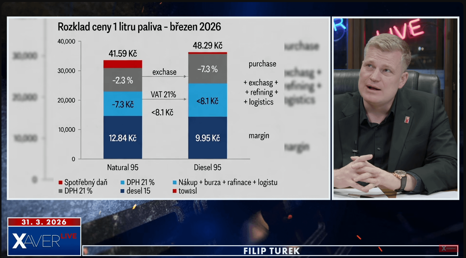 Fun fact je, že DPH + spotřební daň tvoří asi polovinu ceny pohonných hmot. Tipuju, že graf se snažil podle margin sloupce hodit půl ceny na marži benzínek.
