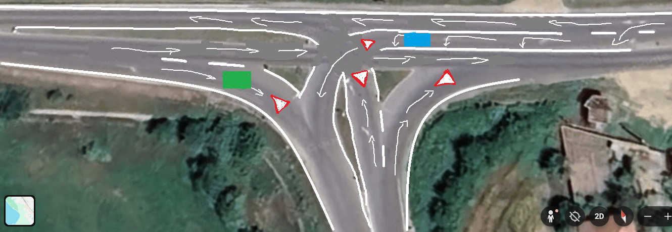 La o intersectie fara insulite separatoare, adica cruce simpla chiar cu 3 benzi: cine face stanga ofera prioritate tuturor, si celor care fac dreapta din fata, cum ar fi cel verde, desi in teorie, albastra intra pe ultima banda si verde pe prima, deci la 3 benzi, nu s -ar intersecta.