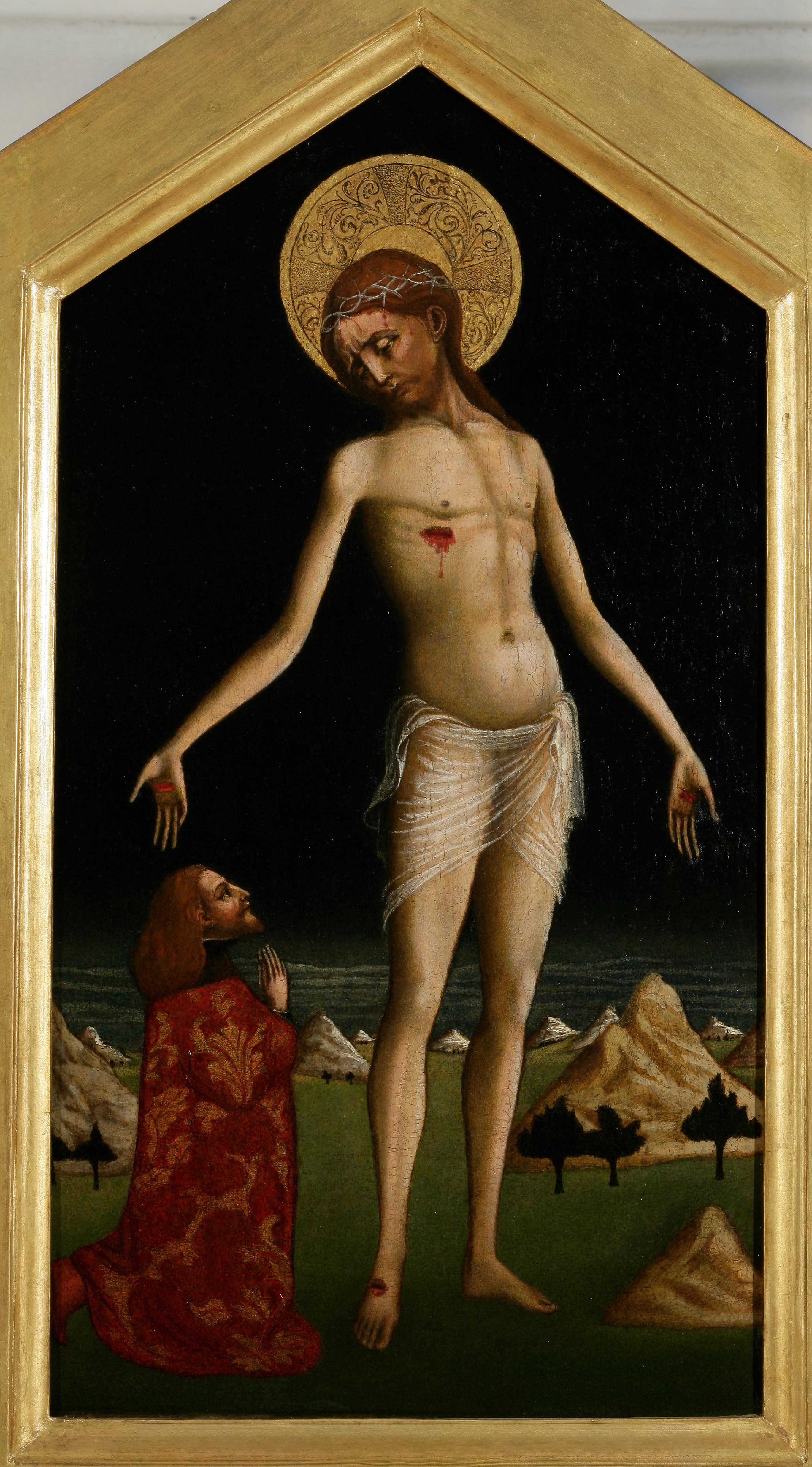 The most precise visual expression of late medieval piety, the Imago pietatis (Latin image of compassion), is the most immediate of all devotional images. Christ is shown most often in a three-quarter or half-length figure, with an erect body, but with prominent wounds that are still bleeding, his head is often tilted to the side and crowned with a crown of thorns, and his hands are lowered, crossed in front of the body or spread by the sides. This painting is specific because it shows Christ in full height, and next to him is the figure of the donor, who is traditionally recognized as the Bosnian king Stjepan Tomaš. His cult was nurtured by the Bosnian Franciscans from whose monastery in Kraljeva Sutjeska the painting originates. Imago pietatis is a purely devotional image that does not depict a specific event, it is an image of the Redeemer who participates equally in life and death. It symbolizes his dual nature, depicting him as dead and yet alive.
