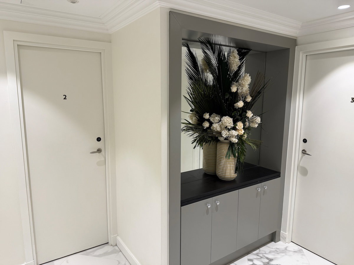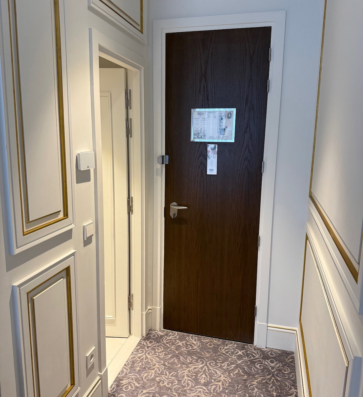 The suite featured an entryway with a half bathroom to the right, and then the living room straight ahead.