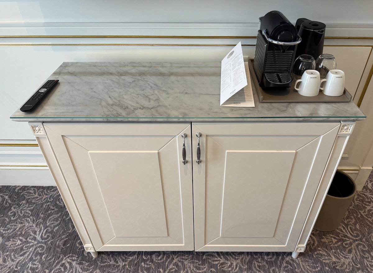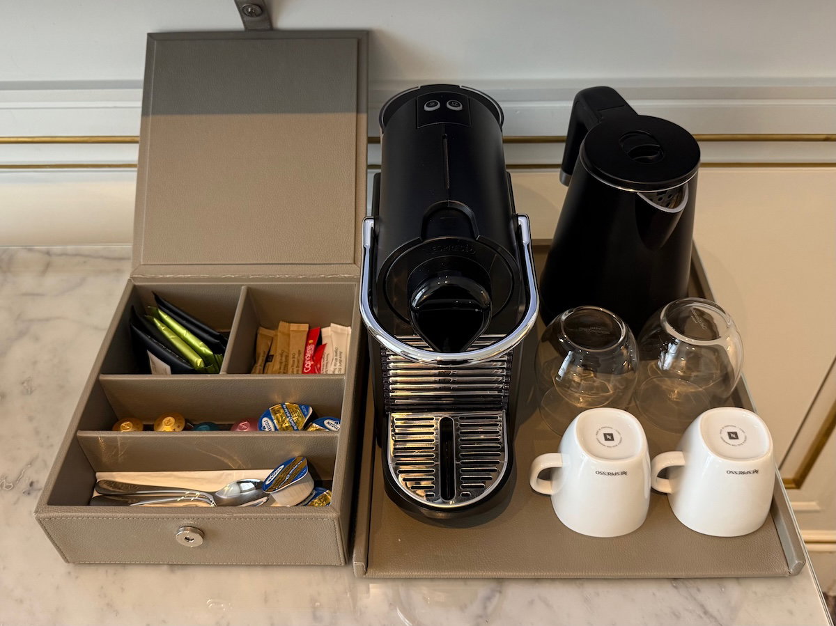 Underneath the wall-mounted TV was a console with a Nespresso coffee machine and kettle.