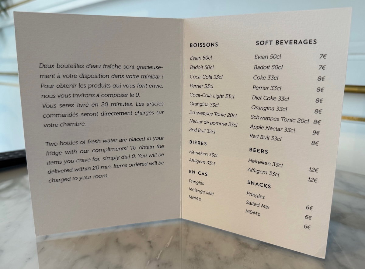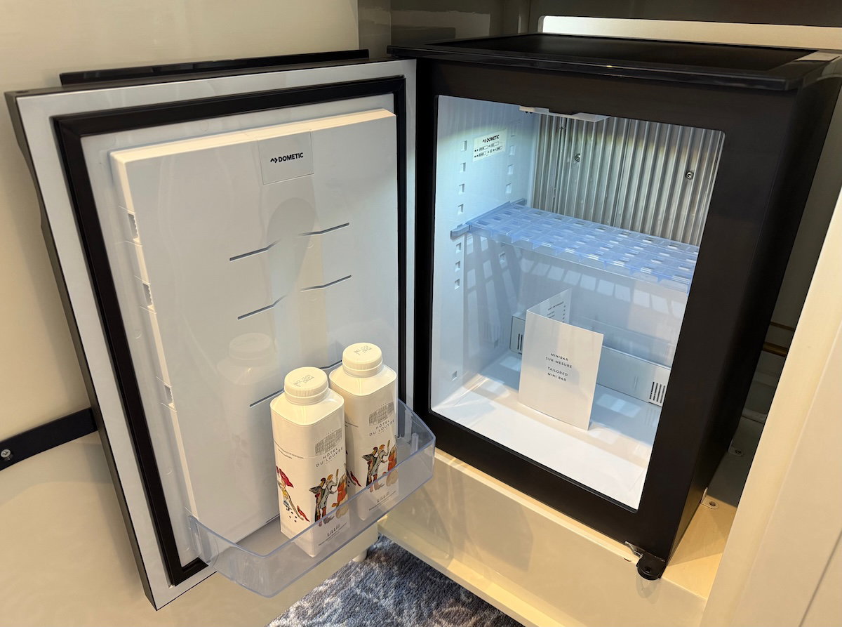 The mini-fridge simply had two complimentary bottles of water. Rather than having a traditional minibar, the hotel instead has a menu off of which you can order minibar items, and they’ll be delivered within 20 minutes of making the request.