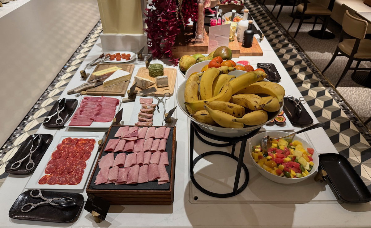 The breakfast buffet was high quality, with cold cuts, cheese, fruit, yogurt, cereal, bread, pastries, pancakes, scrambled eggs, sausage, and more.