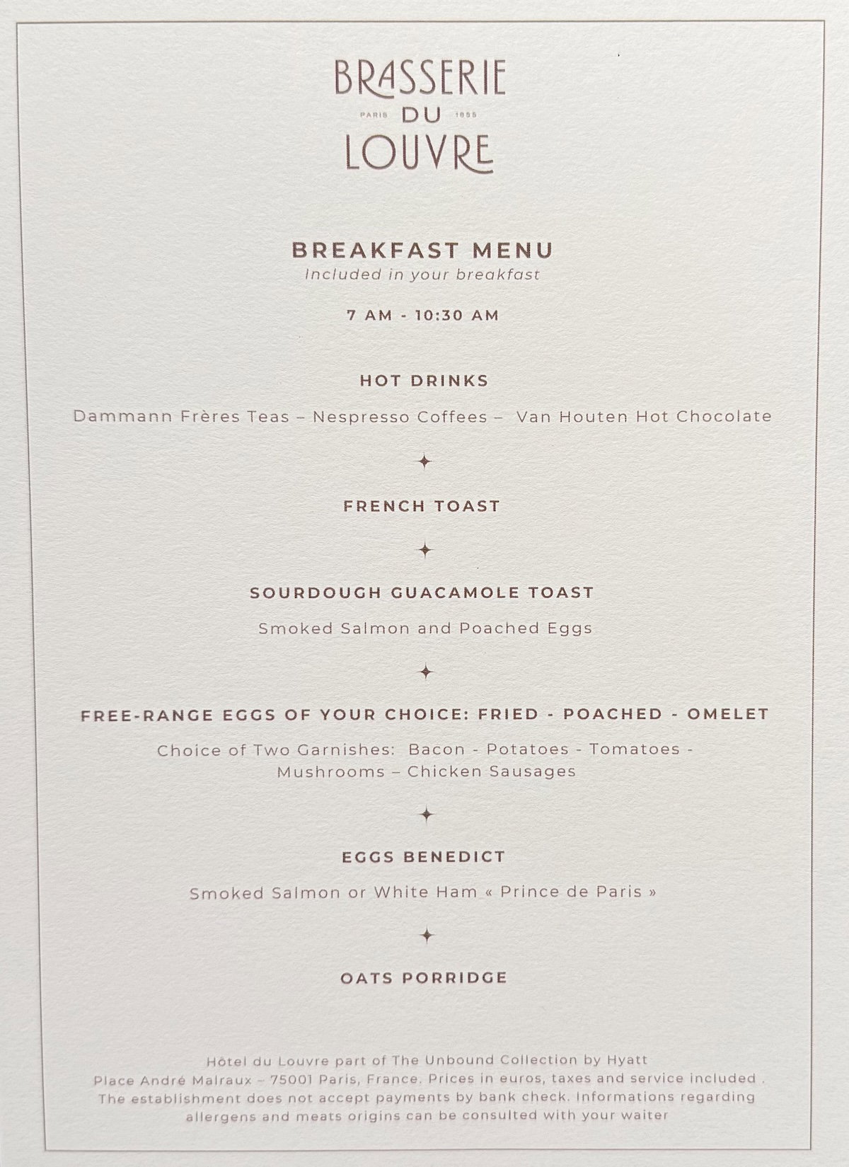 Brasserie du Louvre is open daily from 7AM until 10:30PM, and it serves breakfast, lunch, dinner, and drinks, and you can find all the menus here. I’ve heard lunch and dinner here are excellent, though I only had breakfast during my visit. The restaurant is a good size, with a variety of seating options, both indoor and outdoor (weather permitting).