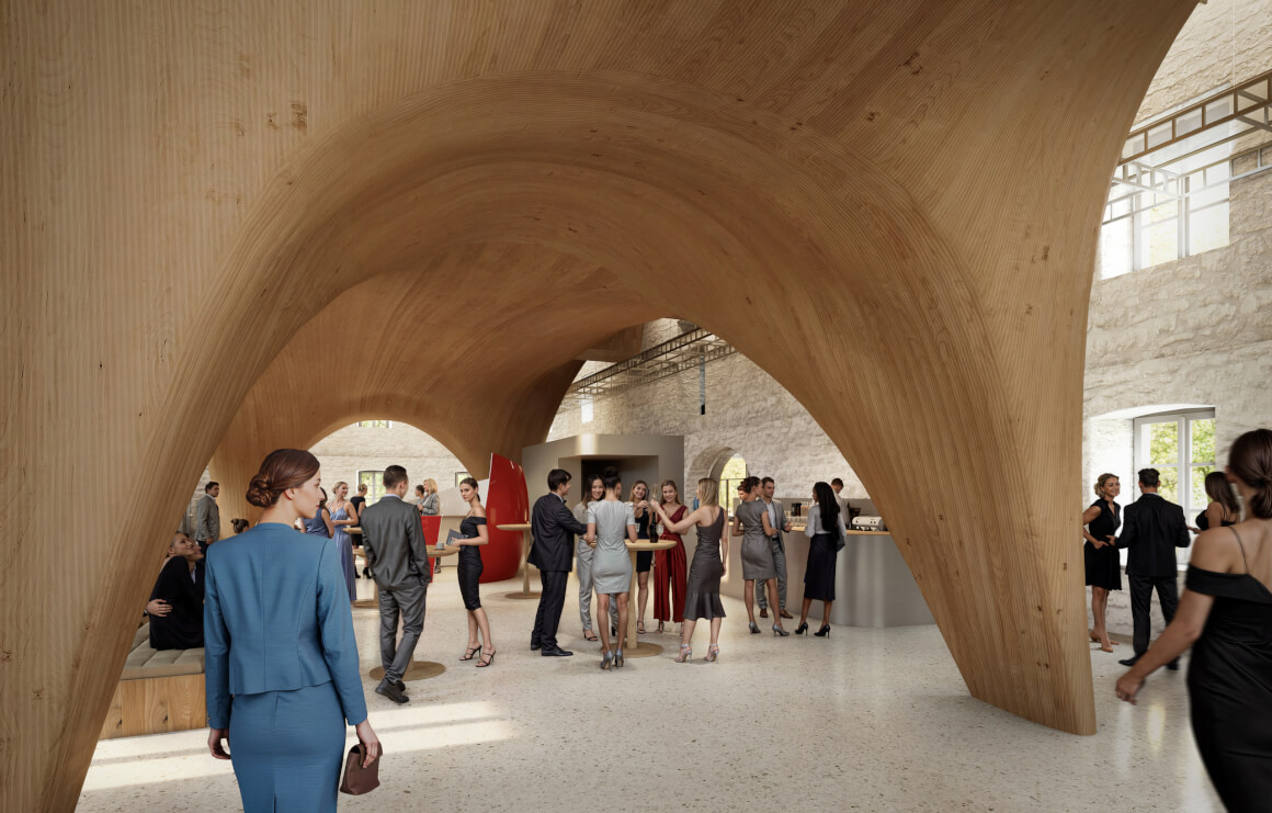 The design inserts a fluid, organically shaped timber volume within the existing masonry envelope, a contemporary architectural gesture that contrasts yet respects the historic fabric.