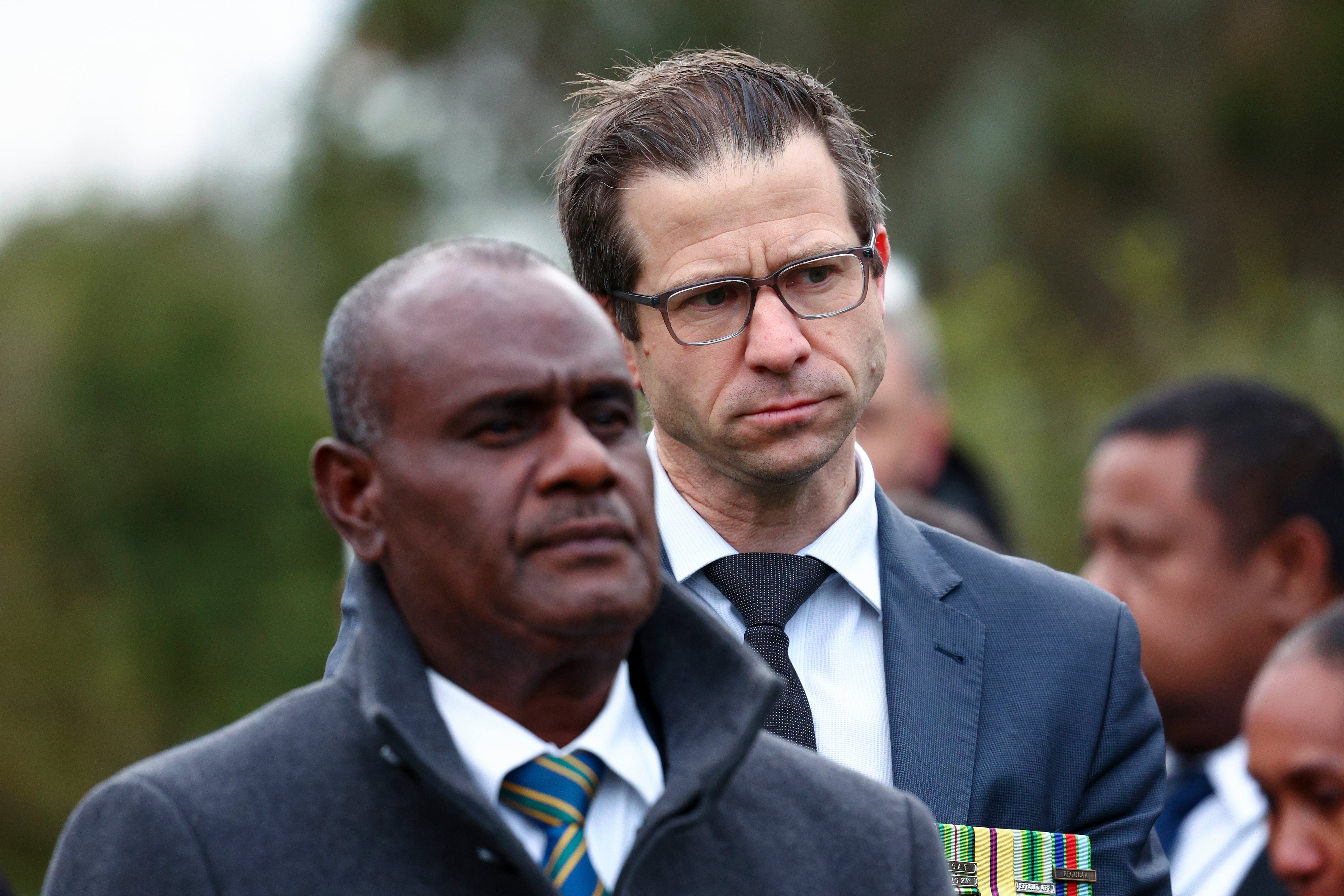 Solomon Islands Prime Minister Jeremiah Manele (L) and then-Minister for Veterans Chris Penk look on during a Wreath Laying Ceremony at Pukeahu National War Memorial Park on July 31, 2025, in Wellington, New Zealand. (Hagen Hopkins/Getty Images)