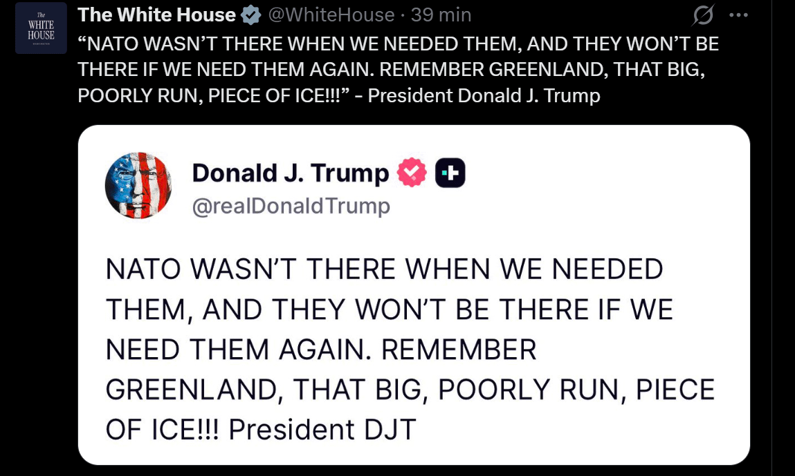 Obviously, this is just another distraction. Since things are going very badly in Iran, he turns his attention to the European Union/NATO. The only thing truly stopping him from invading Greenland is that he knows (I think) it would mean the end of the Atlantic Alliance not to mention potentially a war with Europe. But the truth is, this is all just distraction tactics… there are still three years left before this nightmare ends.