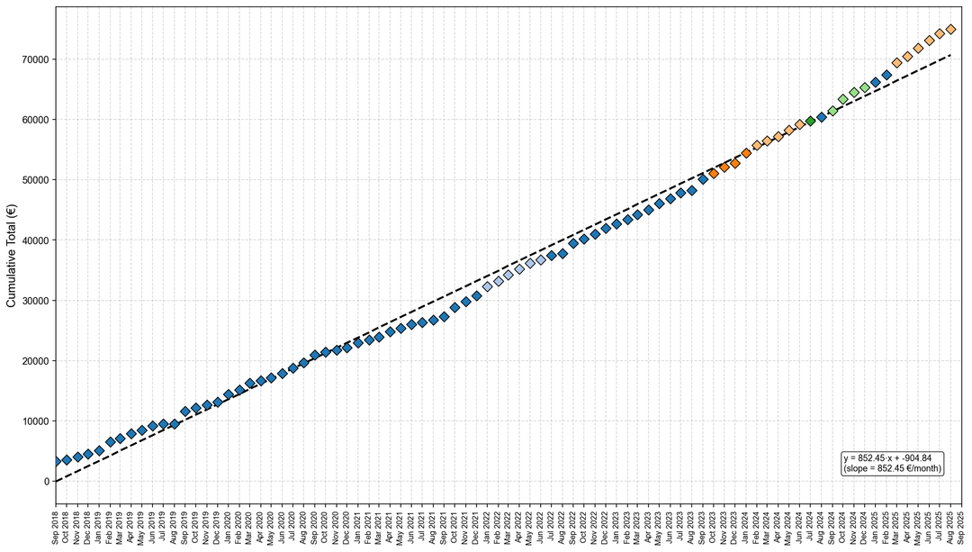The graph is incredibly linear. Made a ton of small trips rather than big ones? I would expect punctual peaks when moving between unis or travelling.