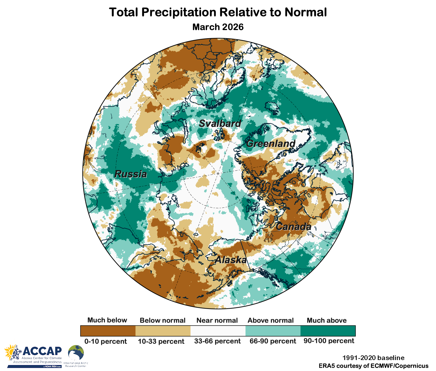 March average precipitation is quite low over much of the Arctic except for the Atlantic Arctic. This year, March totals were especially low across much of the North American Arctic as well as far northeast Russia and northwest Greenland. For Nunavut, Canada, this was driest March in ERA5 reanalysis since 1950 and both Alaska and Chukotka, Russia had the sixth driest March. In a significant change from February, the Atlantic Arctic had well above normal precipitation, including the third highest March total for Iceland since 1950.