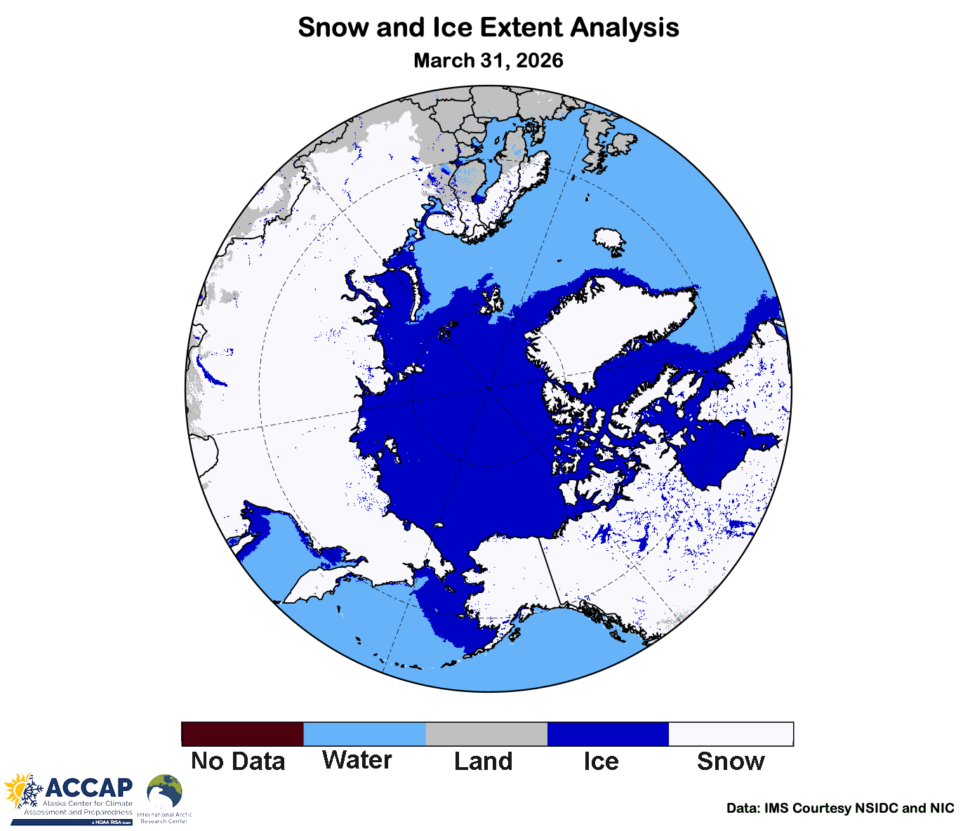 Fig. 5 Snow and ice extent analysis for March 31, 2026. Data from the National Ice Center made available by the National Snow and Ice Data Center.