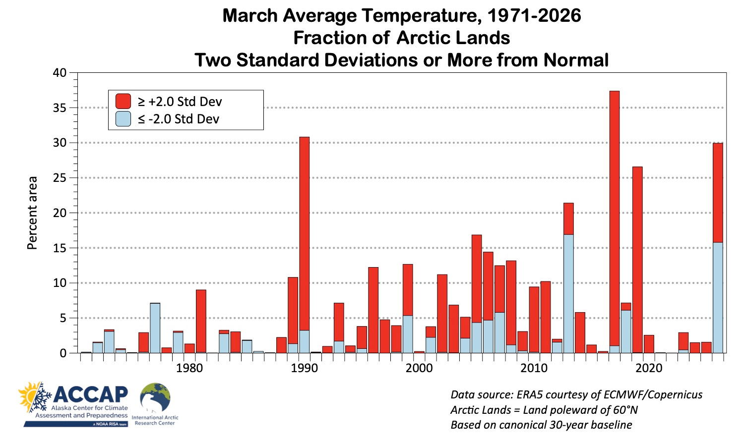 Fig. 3 Areal percentage of the Arctic with March average temperature 2.0 standard deviations or more above or below the canonical 30-year baseline period 1971-2026. Data from ERA5 courtesy of ECMWF/Copernicus and ERA5 data processing courtesy B. Brettschneider.