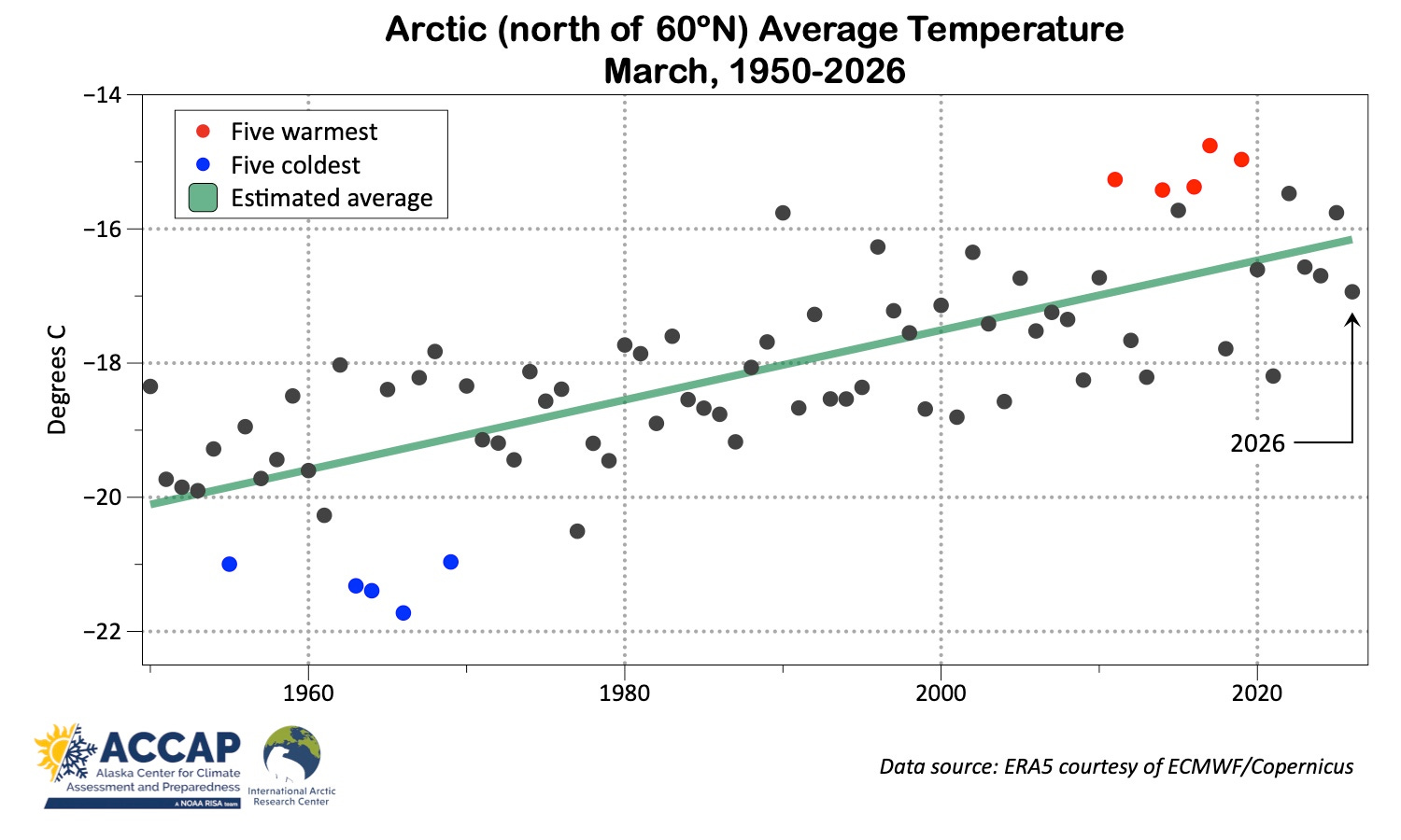 Fig. 2 March average surface temperature 60° to 90°N (lands and seas) each year 1950 to 2026. Time varying average estimated via piece-wise linear regression. Data from ERA5 courtesy of ECMWF/Copernicus.