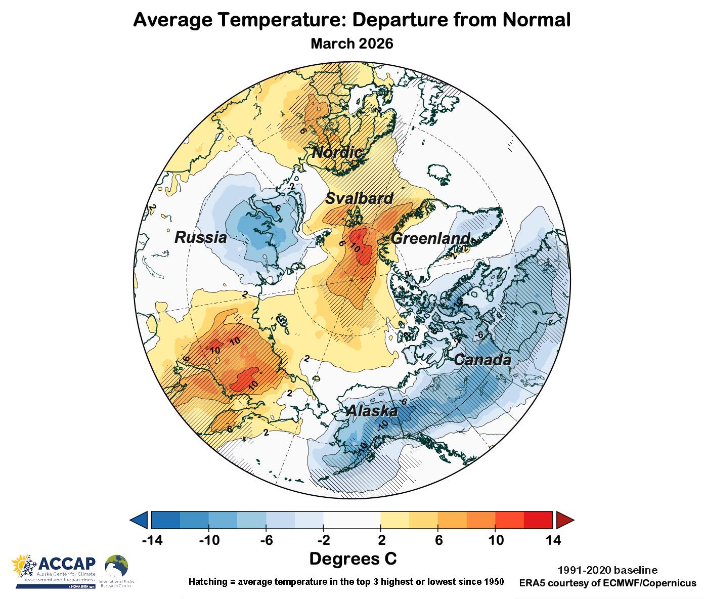 Temperatures in March in the Arctic were characterized by extensive areas where temperatures were far from normal (Fig. 1). These extremes largely balanced out, so for the Arctic overall (land and seas poleward of 60°N) the March average temperature was only 0.2°C above the 1991-2020 average based on ERA5 reanalysis.