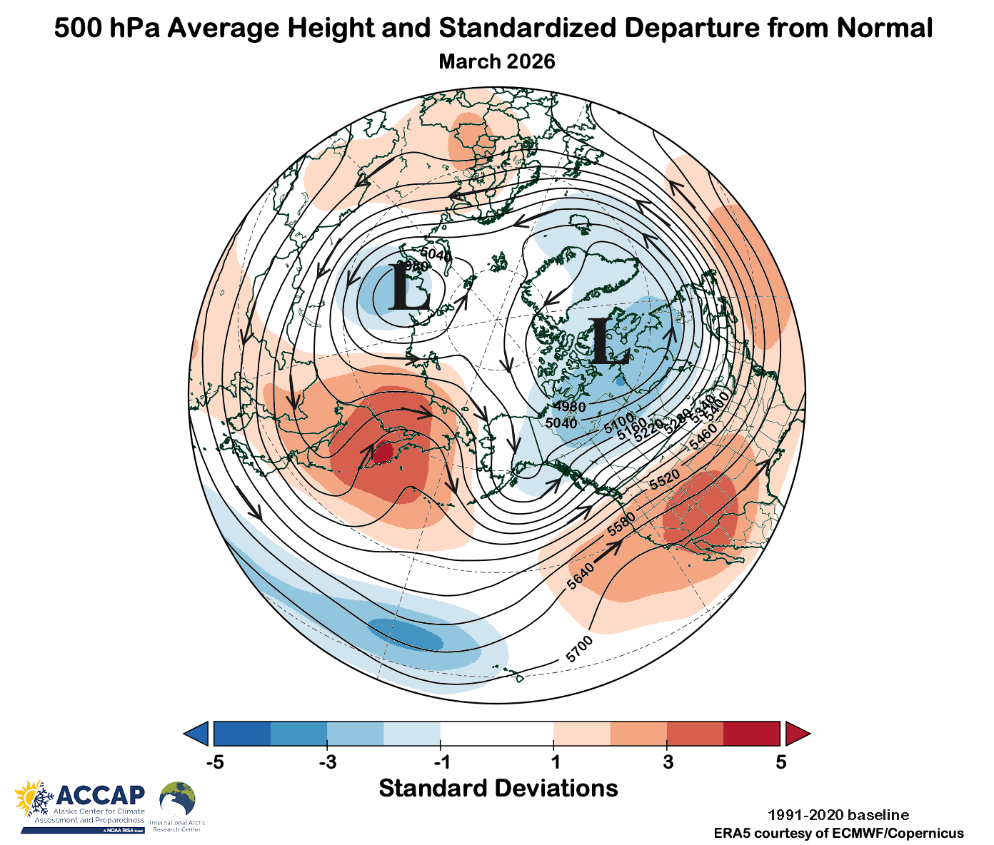 Fig. 6 March average 500 hPa heights (contours) and standard deviations from the 1991-2020 baseline average (colors). Data from ERA5 courtesy of ECMWF/Copernicus.