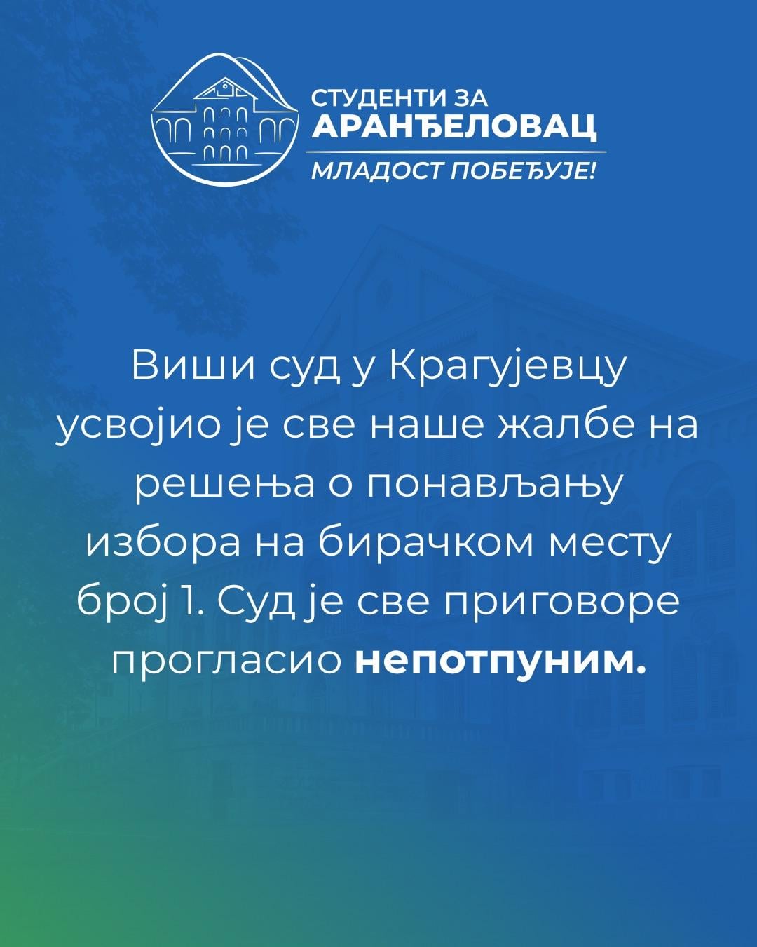Njima je npr. Viši sud u Zaječaru stopirao i poništio onu krađu izbora pa sada moraju na ponovljene, a takođe je taj sud spasao i studentsku listu u Knjaževcu.
