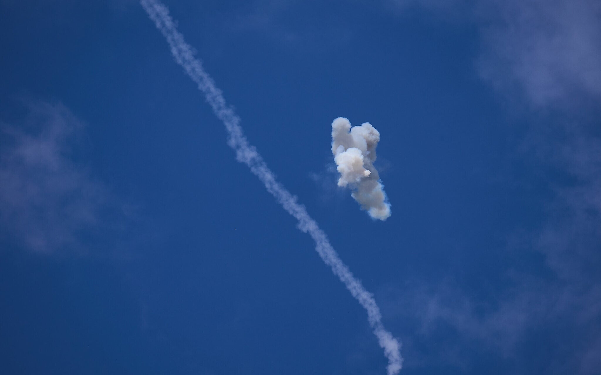 Smoke and explosion following an interception of a Hezbollah rocket over Kiryat Shmona, northern Israel, on the border with Lebanon, April 9, 2026. (AP/Ariel Schalit)