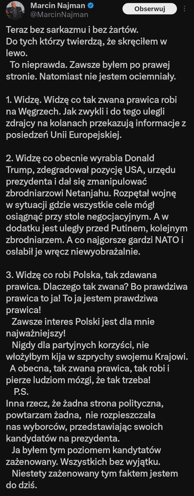 To jest przypadek, że ktoś ma swoje poglądy, miejscami głupie (Najman negował neidawno globalne ocieplenie), ale nie kieruje się polaryzacją i podejściem “my” vs “oni”. A to jest pułapka, w którą wpadło większość polskiej prawicy. Jeśli coś zrobi Trump czy Orban, to czują się w obowiązku go bronić. To jest bardzo krótkowzroczne, bo mogą mieć podobne podejście do UE, ale poza tym bardzo różne interesy. Polska prawica w większości upadła, bo kieruje się odruchem i sentymentami (to, co kiedyś zarzucali lewicy i liberałom). Dlatego Najman na ich tle błyszczy.