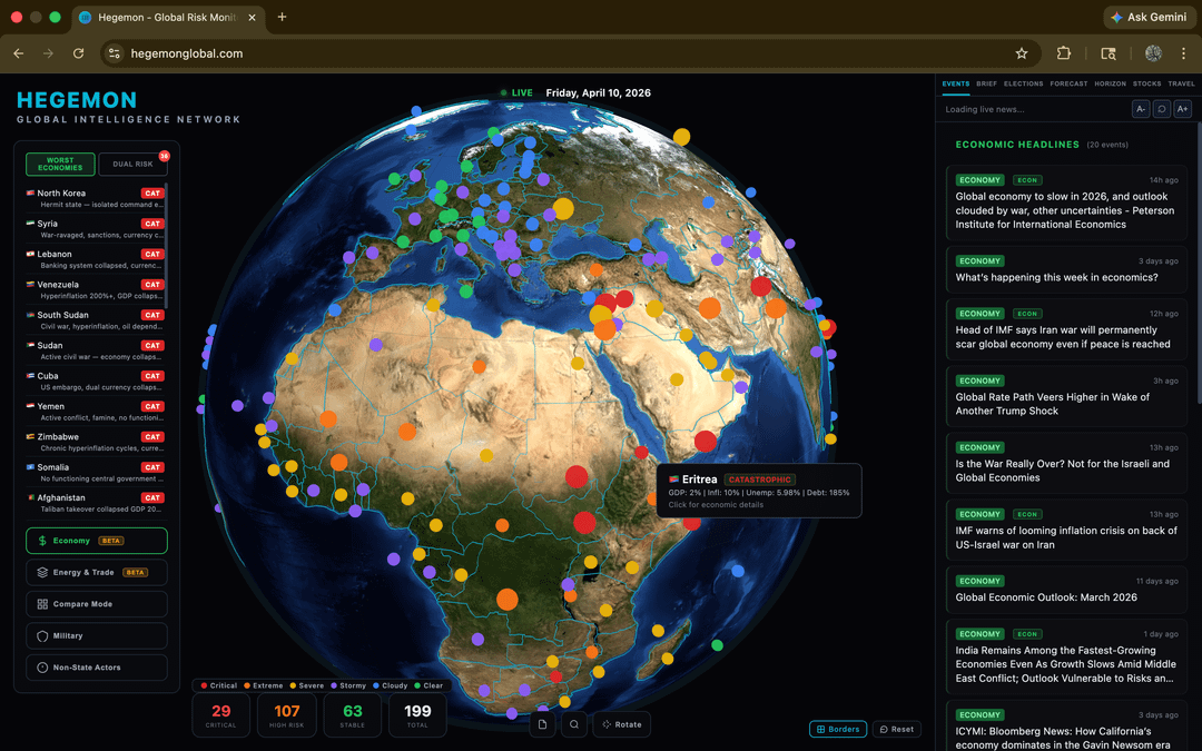 [OC] Major updates to my geopolitical intelligence platform. I added energy infrastructure, economic risk profiles, AI intelligence briefings, election tracking, non-state actors, travel advisories, and expanded all datapoints. 199 countries, hundreds of sources, and free. Would love any feedback!