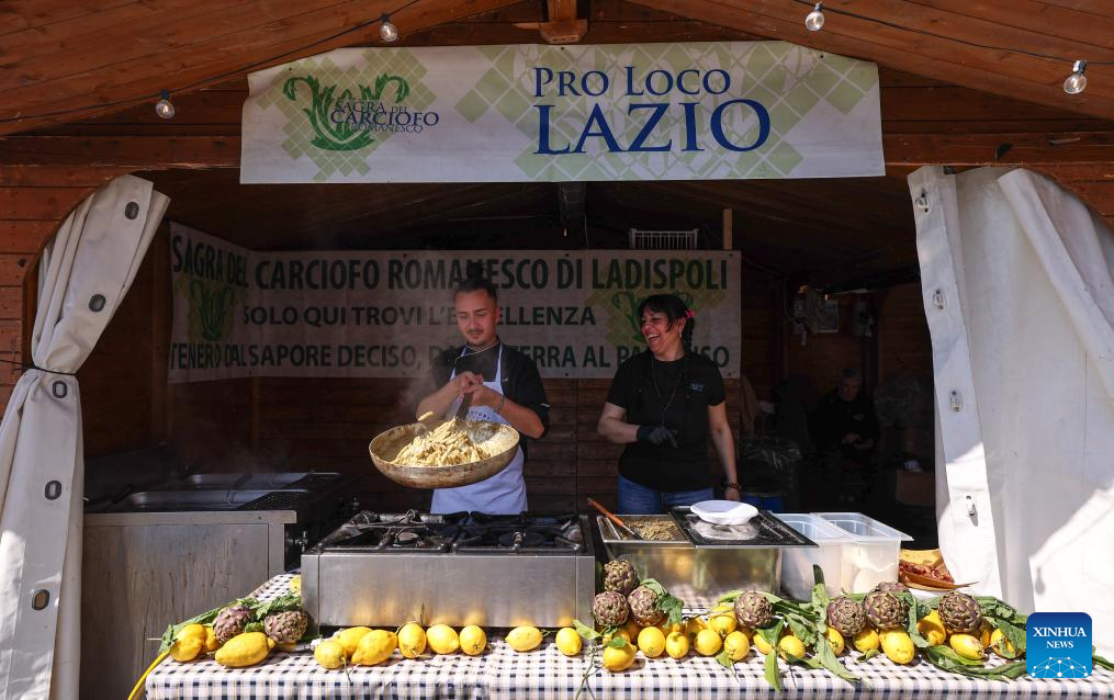 A chef prepares artichoke food during a Roman artichoke festival in Ladispoli, Italy, April 10, 2026. The annual festival celebrating the harvest of the Roman artichoke kicked off on Friday. (Xinhua/Wang Kaiyan)