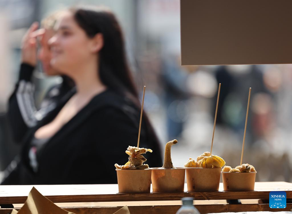 Artichoke snacks are displayed during a Roman artichoke festival in Ladispoli, Italy, April 10, 2026. The annual festival celebrating the harvest of the Roman artichoke kicked off on Friday. (Xinhua/Wang Kaiyan)