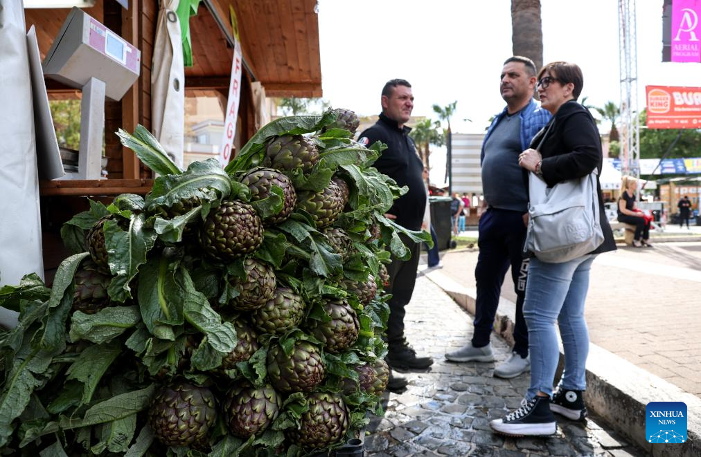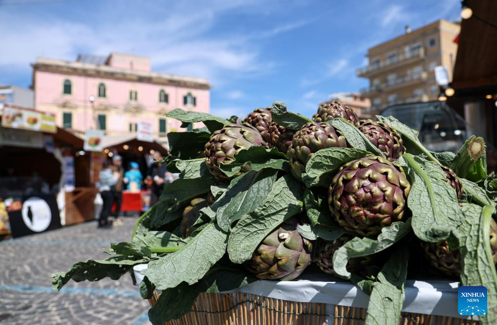 Artichokes are pictured during a Roman artichoke festival in Ladispoli, Italy, April 10, 2026. The annual festival celebrating the harvest of the Roman artichoke kicked off on Friday. (Xinhua/Wang Kaiyan)