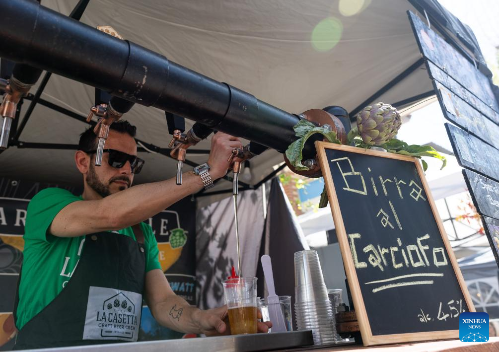 A vendor fills a cup with artichoke beer from a tap during a Roman artichoke festival in Ladispoli, Italy, April 10, 2026. The annual festival celebrating the harvest of the Roman artichoke kicked off on Friday. (Xinhua/Li Jing)