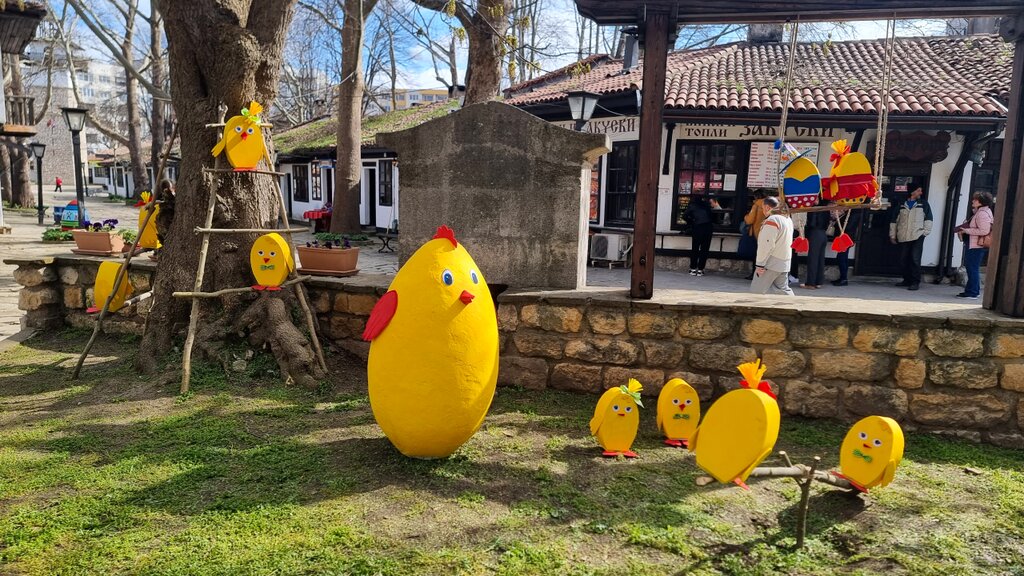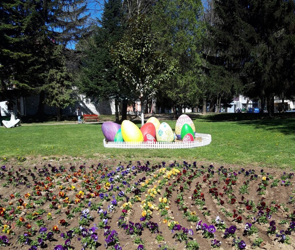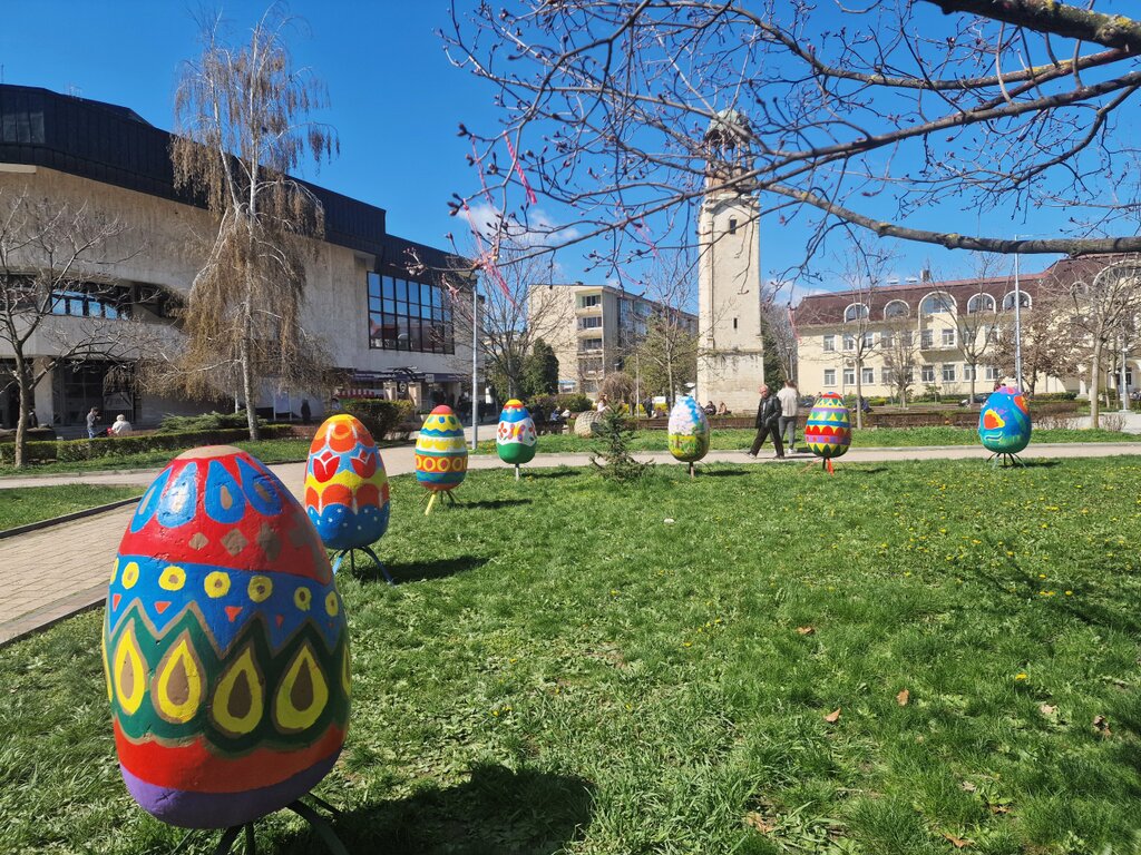 Easter decorations are delighting residents and visitors alike. Large decorative eggs and rabbits have been placed in the garden by the Clock Tower and in the city park. A colourful Easter arch links the municipal cultural centre with the monument to Master Manol, while a designated photo area has also been set up.