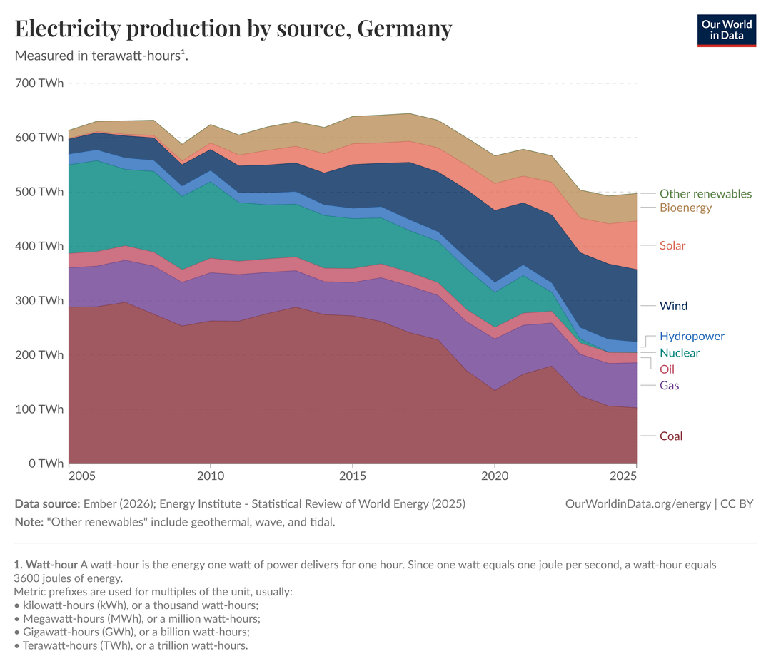 Loki-L on April 11, 2026 3:25 pm The Fraunhofer Institue has a bunch of much better charts that you can dig deep and get much better insight than from the stuff from ourworldindata. for example: [https://www.energy-charts.info/charts/power/chart.htm?l=en&c=DE](https://www.energy-charts.info/charts/power/chart.htm?l=en&c=DE) and: [https://www.energy-charts.info/charts/energy_pie/chart.htm?l=en&c=DE&interval=year&year=2025](https://www.energy-charts.info/charts/energy_pie/chart.htm?l=en&c=DE&interval=year&year=2025)