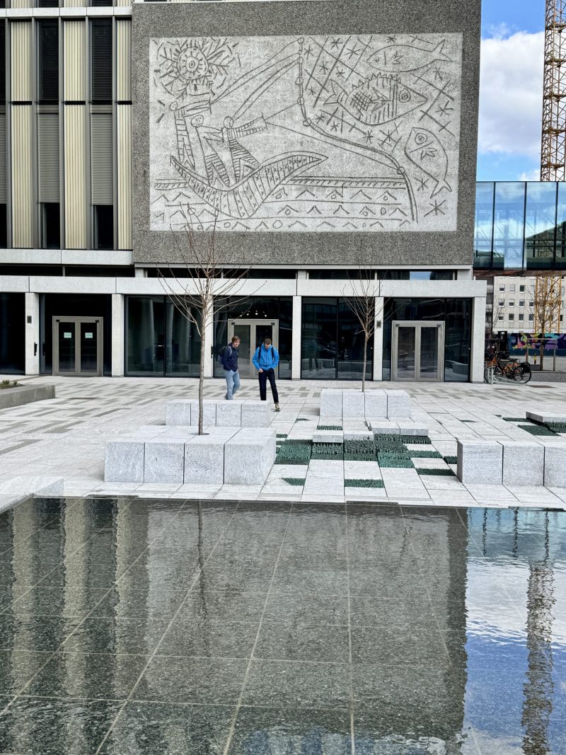 It was important for many involved in the rebuilding of the government complex to retain its artwork and this reflection pool tied to its highest building. That included the above work by Pablo Picasso and Carl Nesjar that formerly adorned the so-called Y-blokka, which was controversially torn down. Now the Picasso is back, and mounted on the brand new A-blokka.