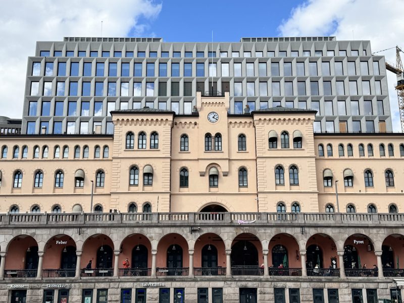 The new Office of the Prime Minister is shown here from behind, towering over Oslo’s former police station and jail, which in turn rises over the historic arcade at the large public square known as Youngstorget. The square is also home to the Labour Party’s headquarters and often used for large public rallies and other events. The clock on the old police station was for years frozen at the time of the bomb blast on a Friday afternoon in late summer, but it’s working again now, too.